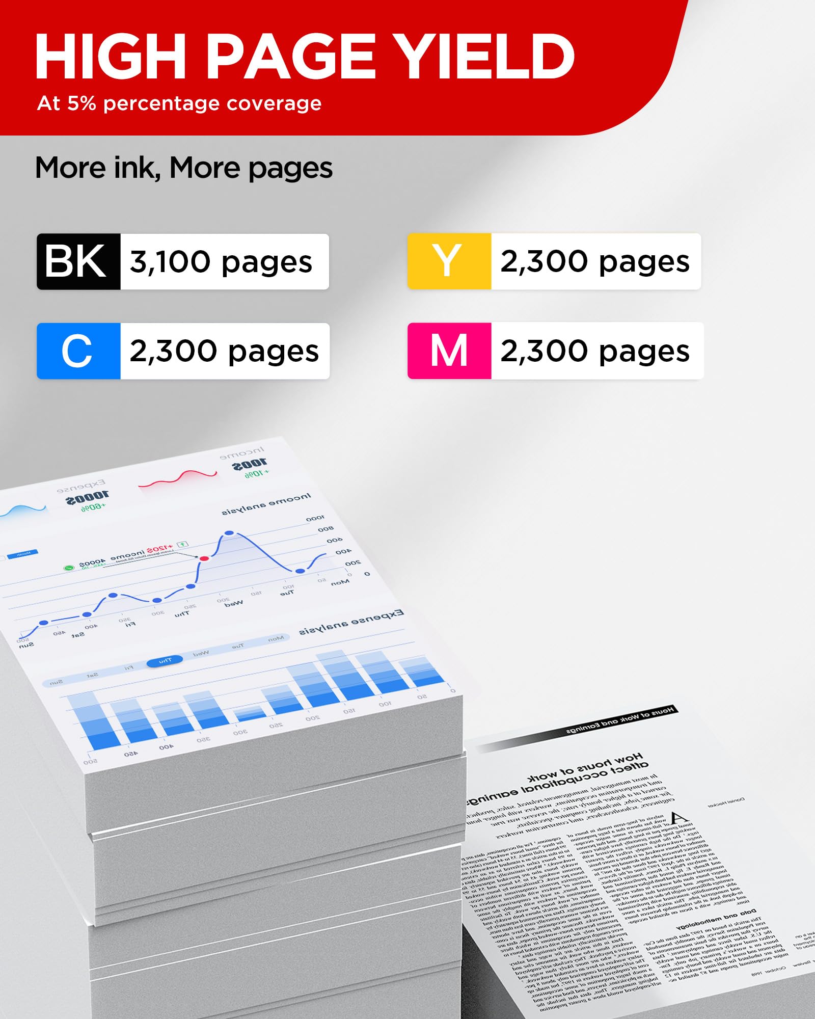 - High Page Yield: Print up to 3,100 pages with the black 054H cartridge and 2,300 pages per color (Cyan, Magenta, Yellow) at 5% coverage (A4). More pages than standard 054 toners.