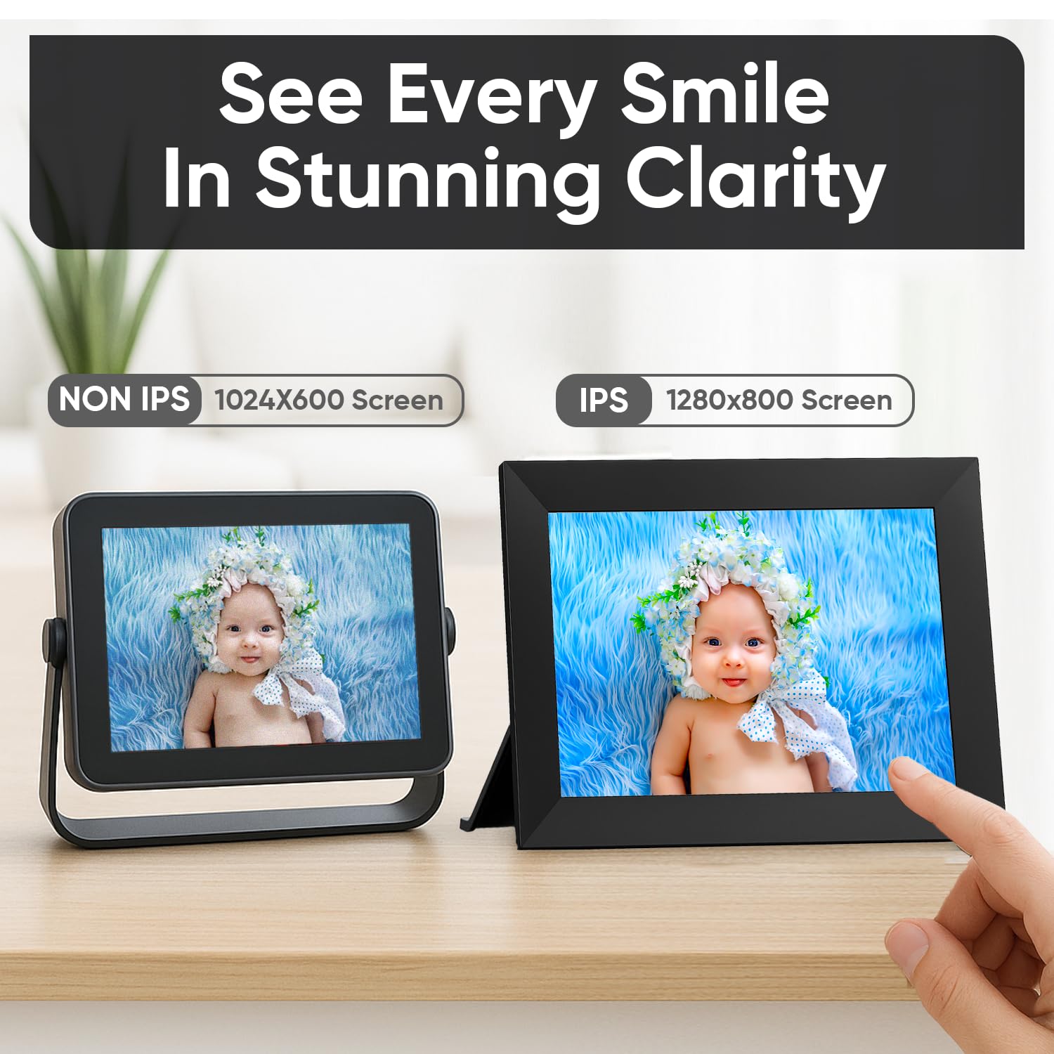 - 10.1" HD IPS Touchscreen with 1280×800 resolution displays vibrant, true-to-life photos from any angle. The wide 180° viewing ensures everyone in the room can enjoy crystal-clear memories together, whether the frame is wall-mounted or on a tabletop.