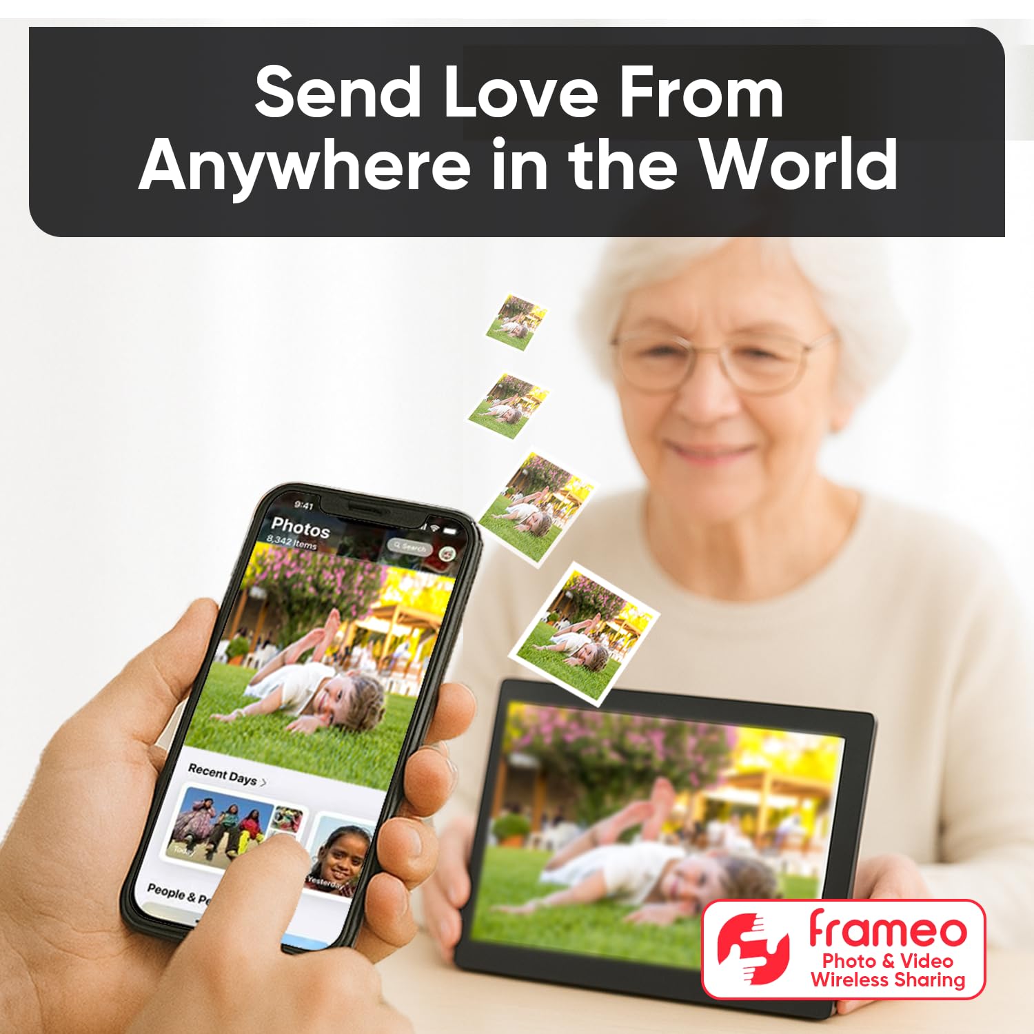 - WiFi connectivity and Frameo app make it easy to send photos and 15-second videos directly to the frame anytime, from anywhere. Loved ones can share real-time updates instantly, creating connection across distances, especially with grandparents.