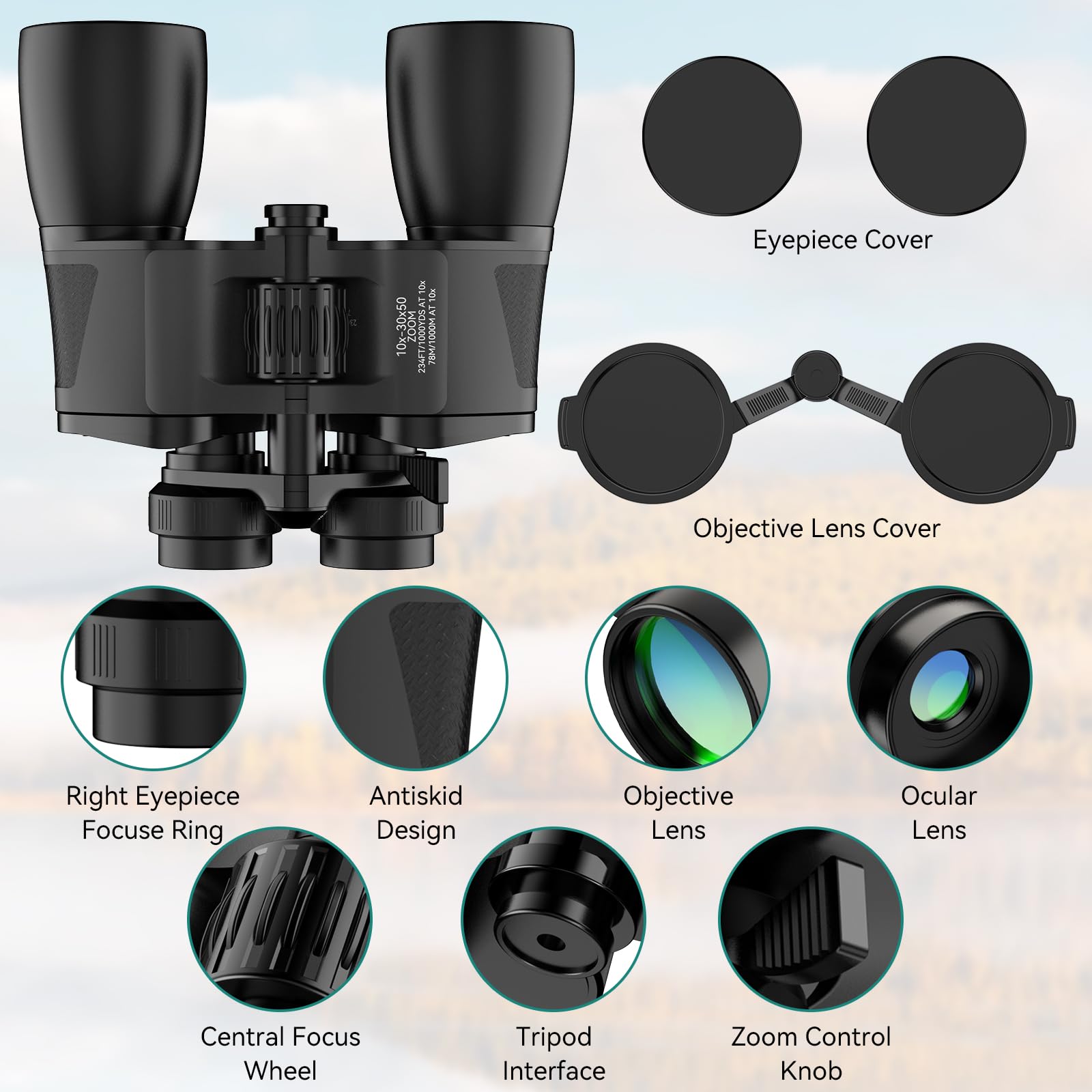 - 【High Power Zoom Binoculars】: The 10-30X50 binoculars for adults have 10-30X power magnification, 50mm large objective lens, let you to quickly focus on your target for great detail even from 235 feet or 1000 yards away. It boasts an ultra-wide field of view and crystal-clear resolution, making it the perfect companion for birdwatching, hunting, camping, mountain climbing, hiking, traveling, operas, concerts, sports events, and stargazing.