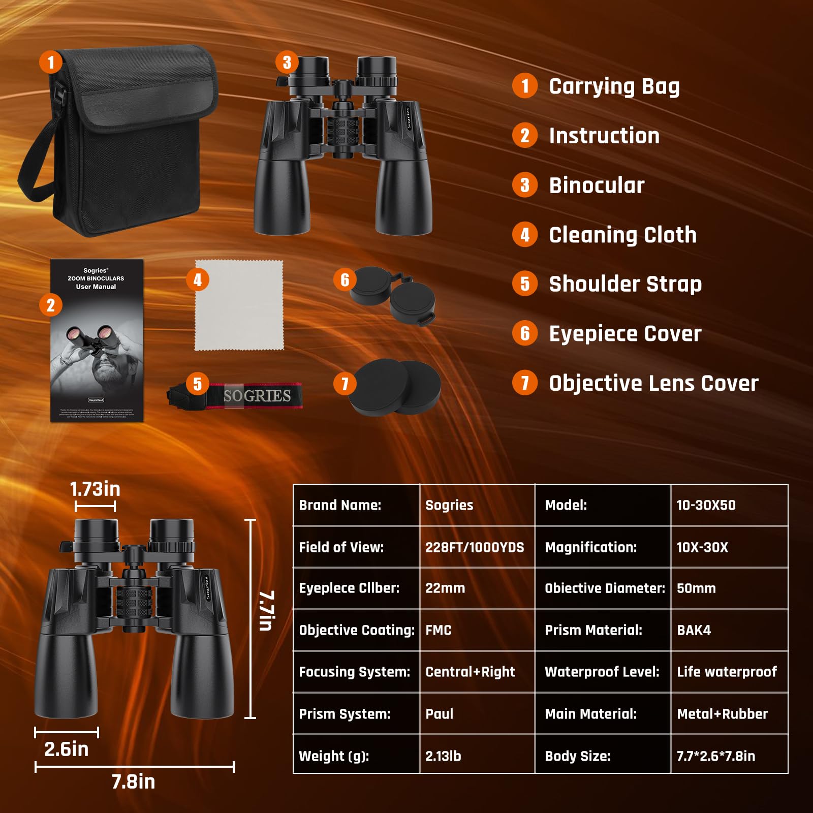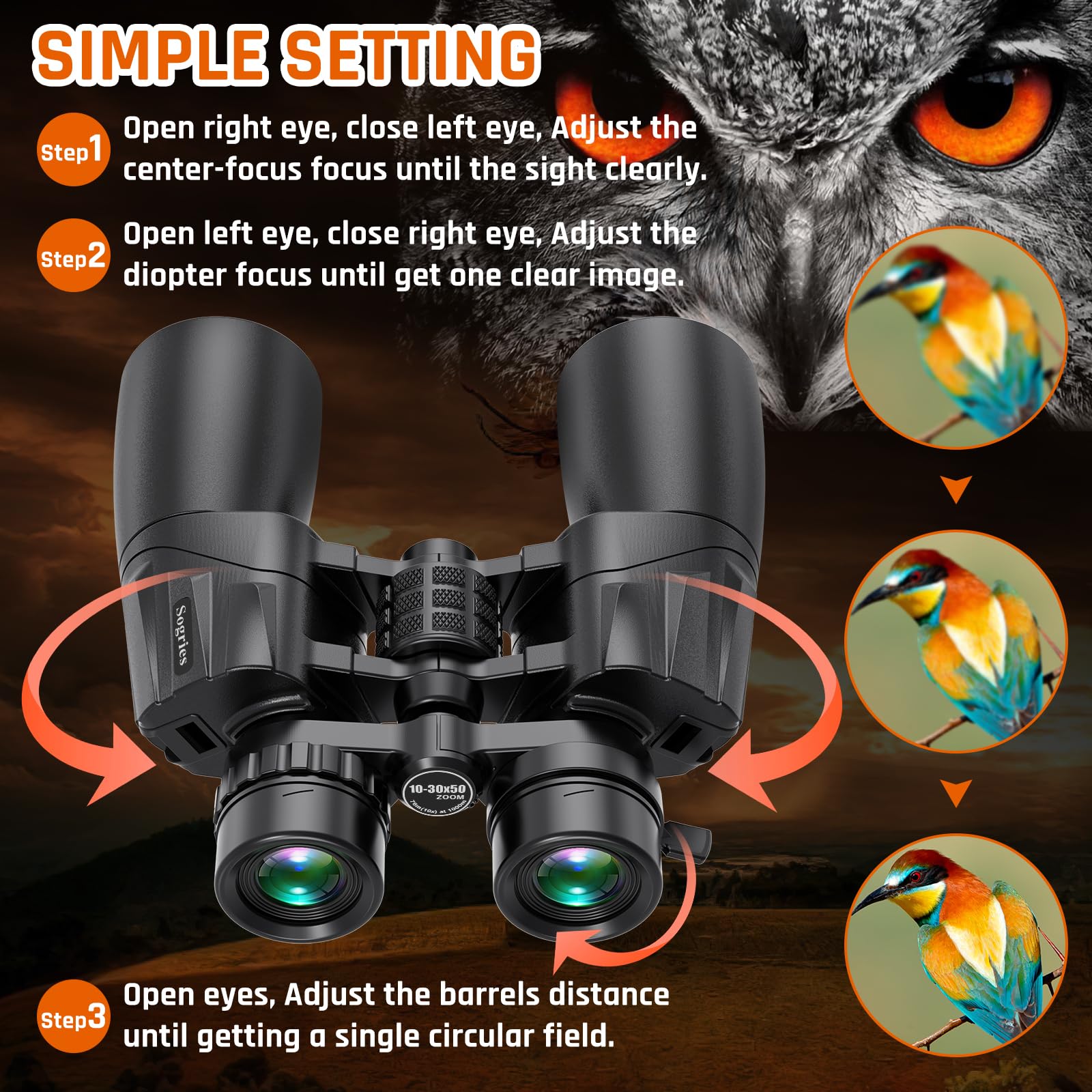 10-30x50 Zoom Binoculars for Adults, High Powered Military Binoculars for Bird Watching Traveling Hunting Concerts with Large View,BAK4,FMC Lens,Clear Low Light Vision at Night
