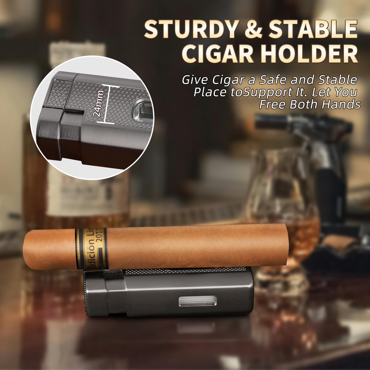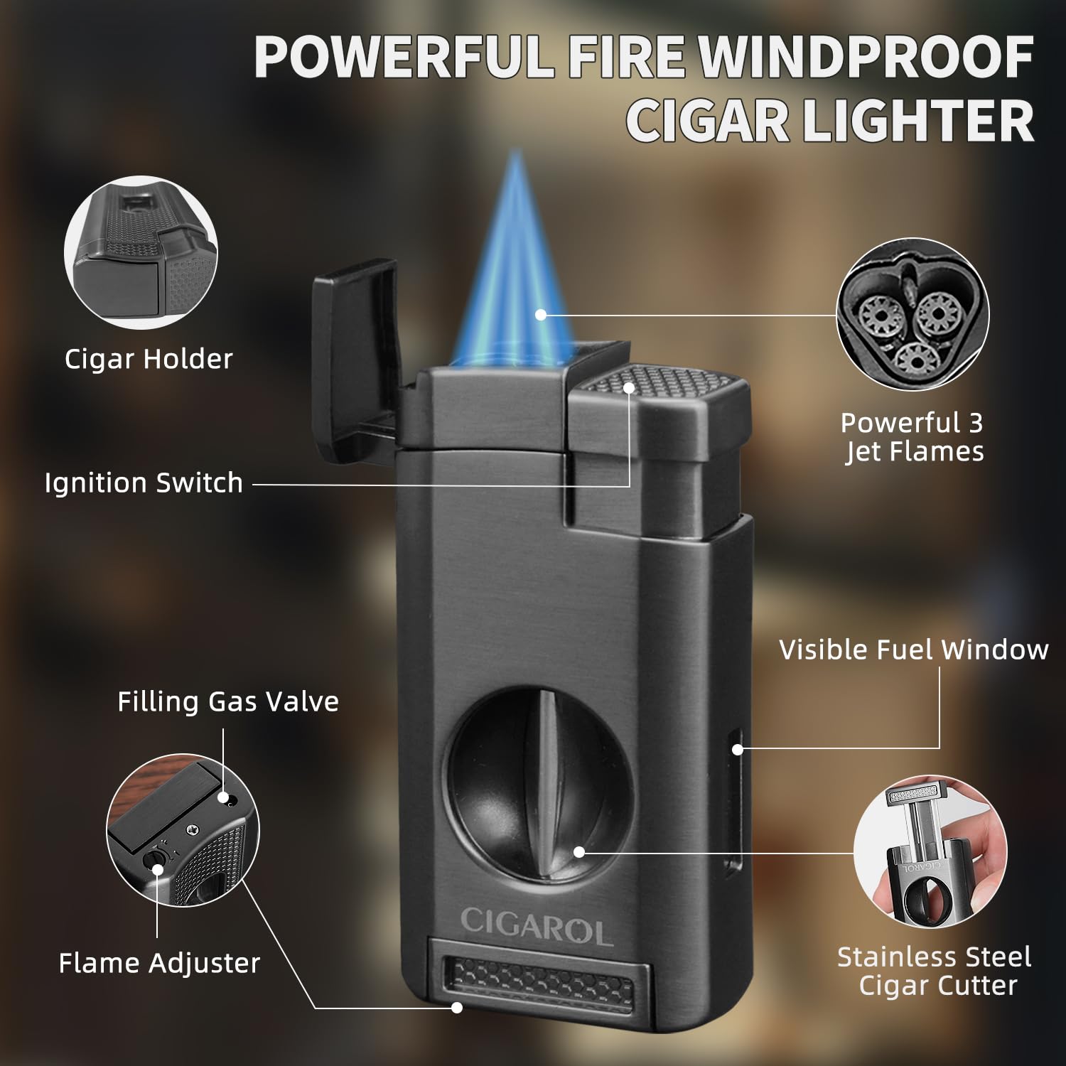 - Provide Cigar Lighter and Humidifier: Comes with a portable refillable cigar lighter ( Butane Fuel Not Included) and humidifier.The adjustable triple fire lighter is much more efficient than a single.You also can adjust the flame adjuster on the bottom to meet your needs. Lgnition in seconds. Adding cigar moisturizing liquid (or distilled water) to the humidifier can increase the humidity molecules and maintain the required humidity of the cigar.