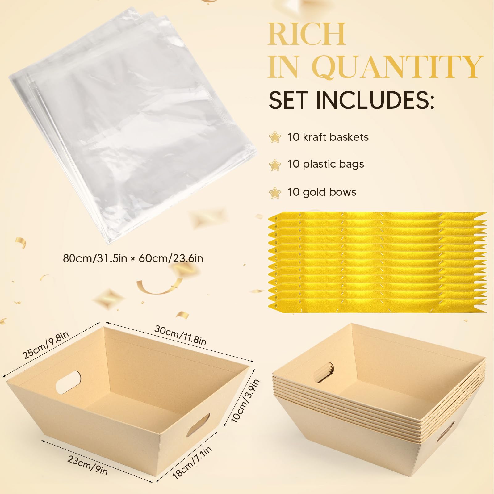 - Complete Empty Gift Basket Set: The gift basket Kit consists of 10 brown empty gift baskets, 10 quality plastic bags, and 10 gold bows. Abundant in quantity and complete in accessories, it is the decoration that makes your holiday gift look more advanced.