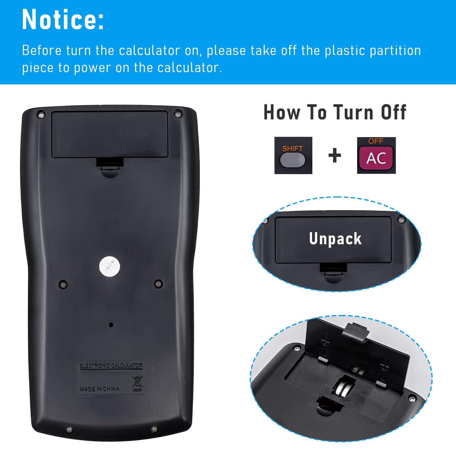 - 2 Line Clear Display: this math calculator has a 12 digit high definition display widescreen, and a 2 line display allows the input numbers which can effectively avoid errors in the calculation process and improve work efficiency (our calculator comes with battery and uses 2 LR1130 battery not solar)