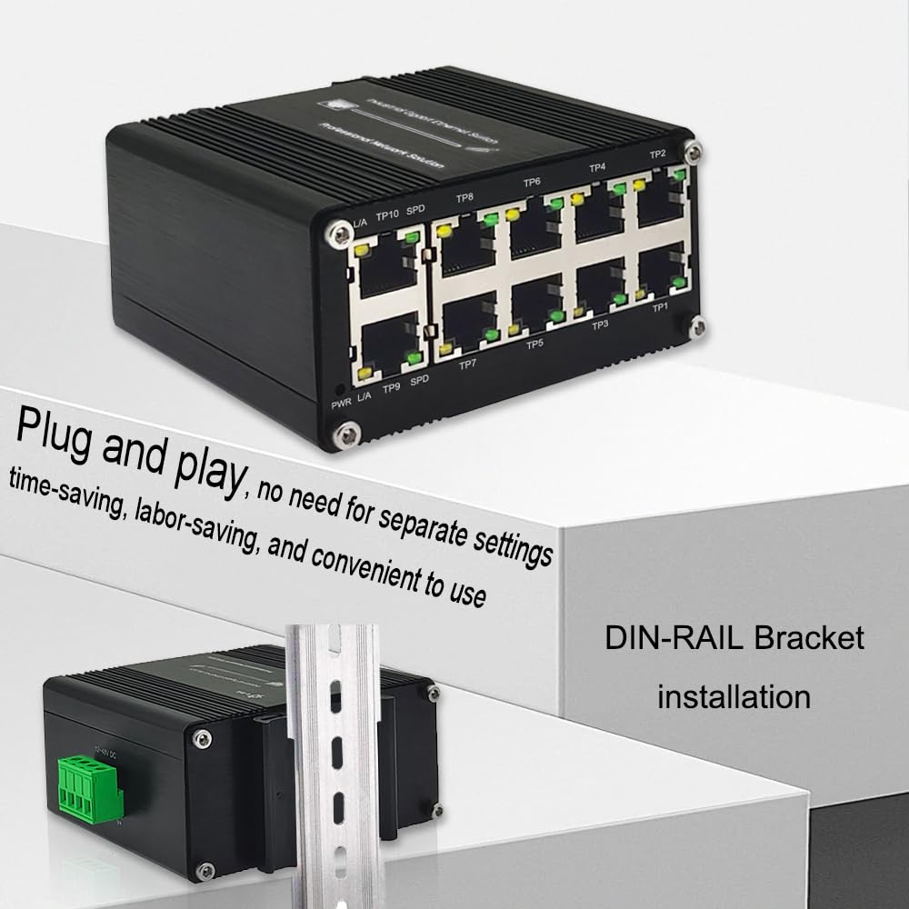 - Fast Connection Ethernet Switch - 10 Port Gigabit Switch: This industrial-grade unmanaged Ethernet switch features 10 ports with 10/100/1000BASE-T RJ45, providing fast and reliable network connectivity.