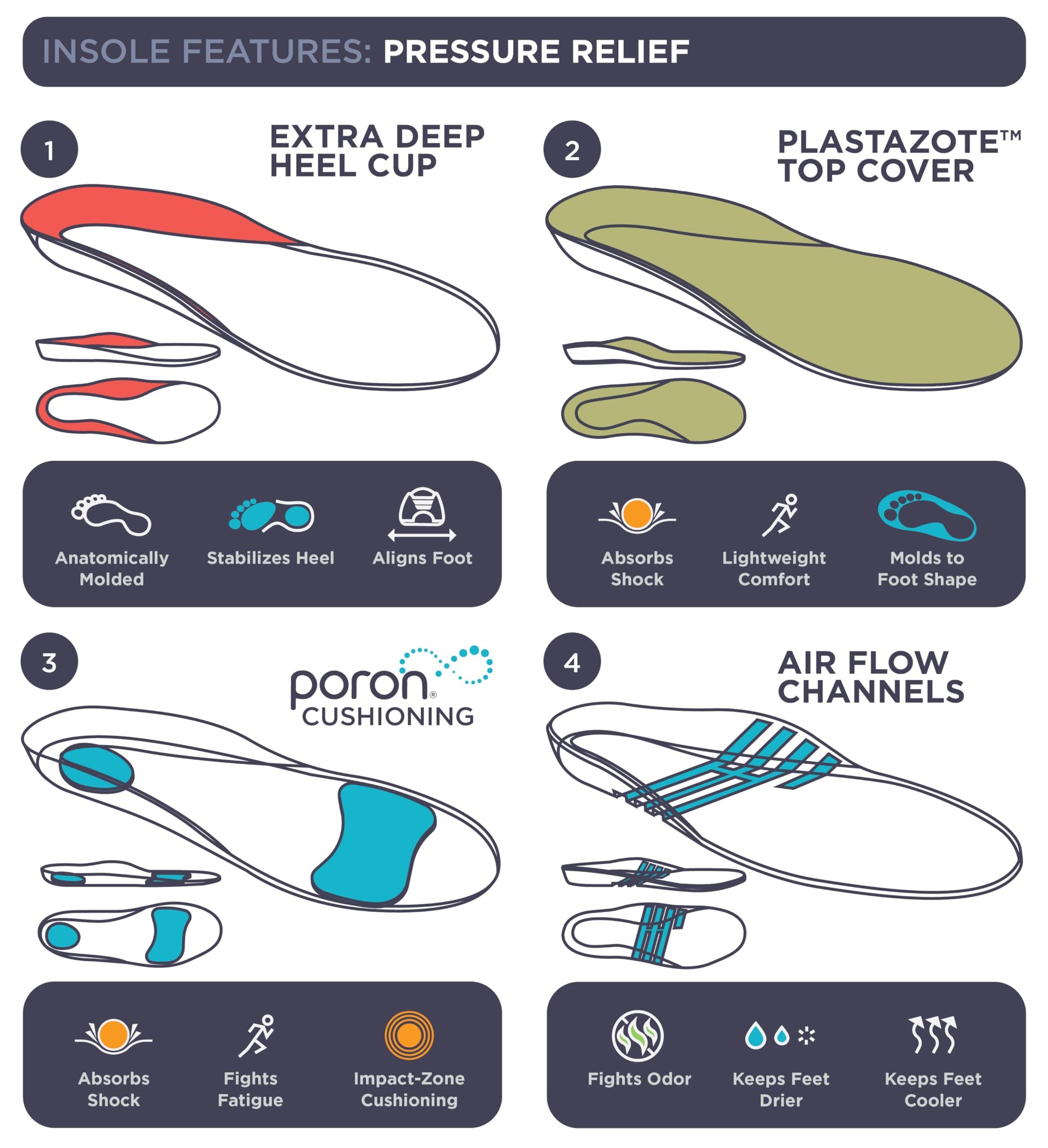- Air Flow Chanel – Let's air circulate around the insole, helps keep a dry and cool foot.