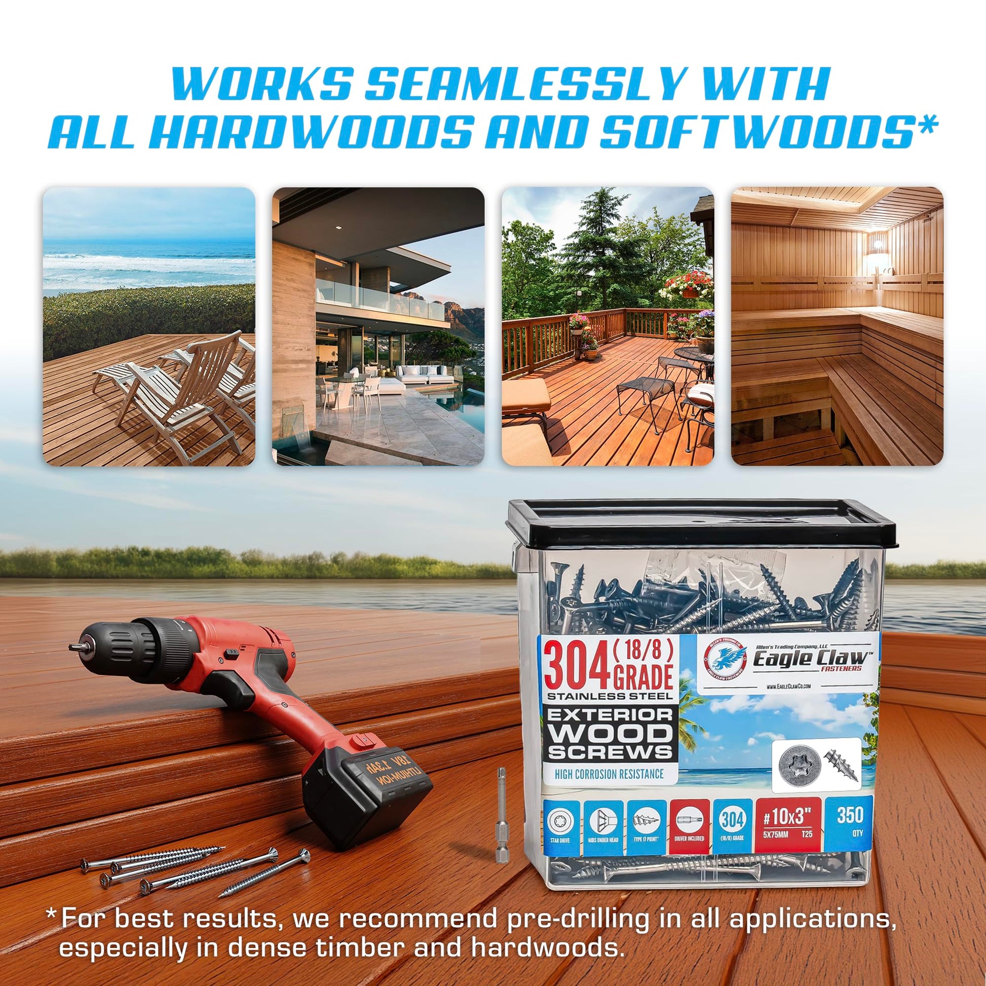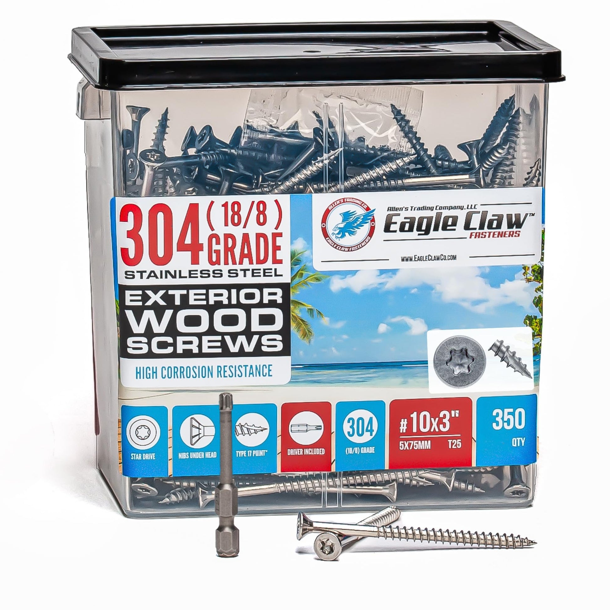 #10 x 3 Inch Stainless Steel Deck Screws 350 Pieces | T25 Star Torx Drive Flat Head | 304 Grade Stainless Steel Wood Screws High Corrosion Resistance by Allen's Trading Co. Eagle Claw Fasteners