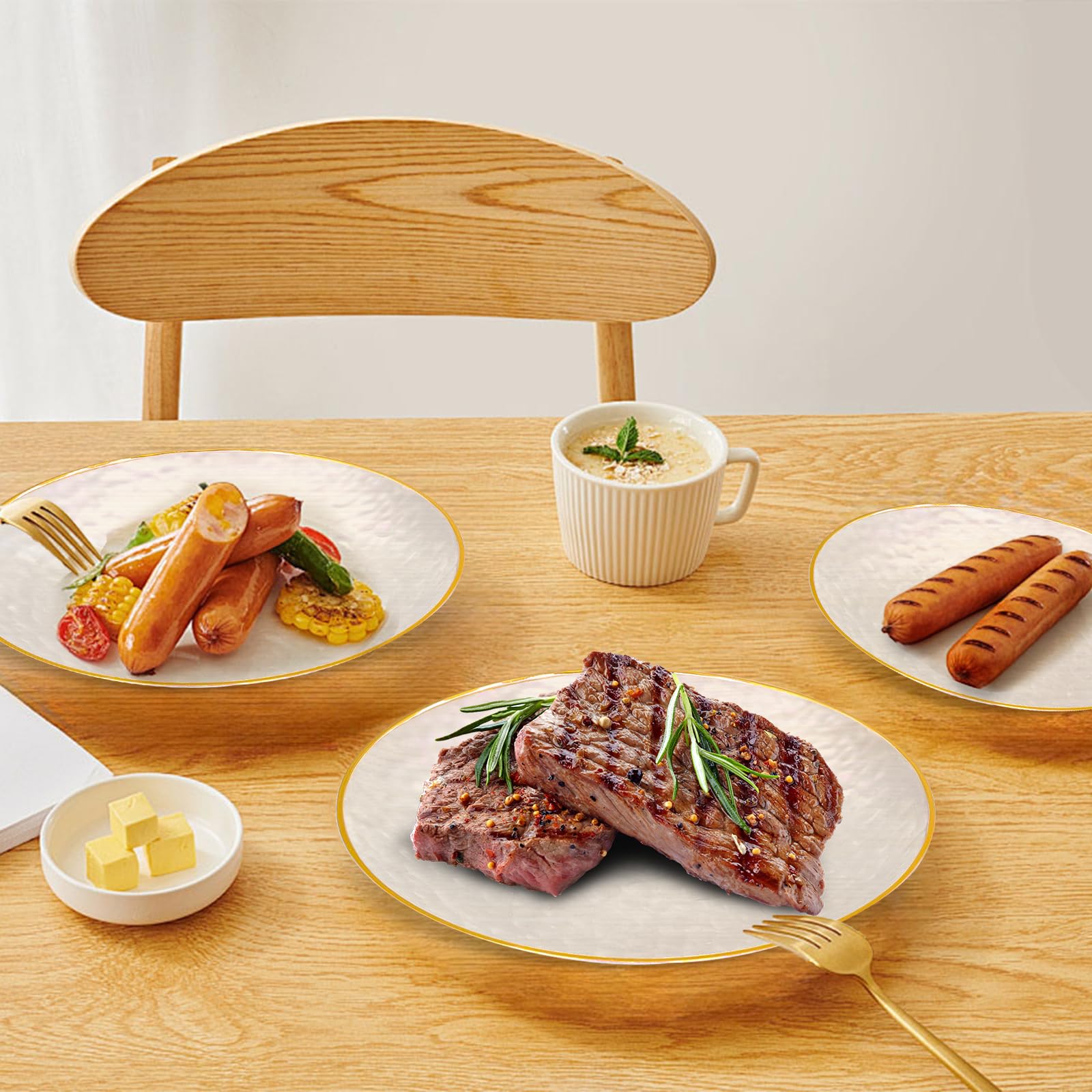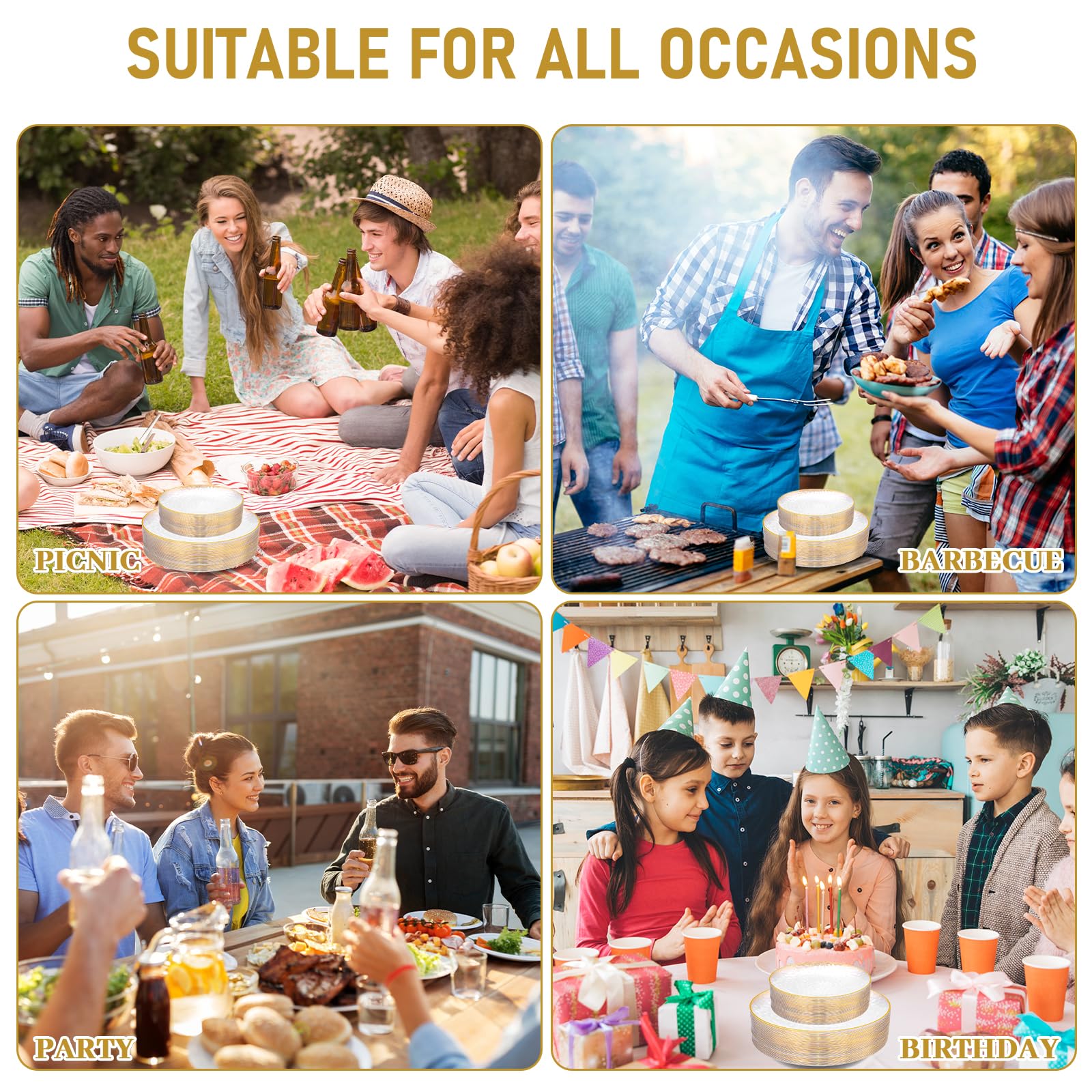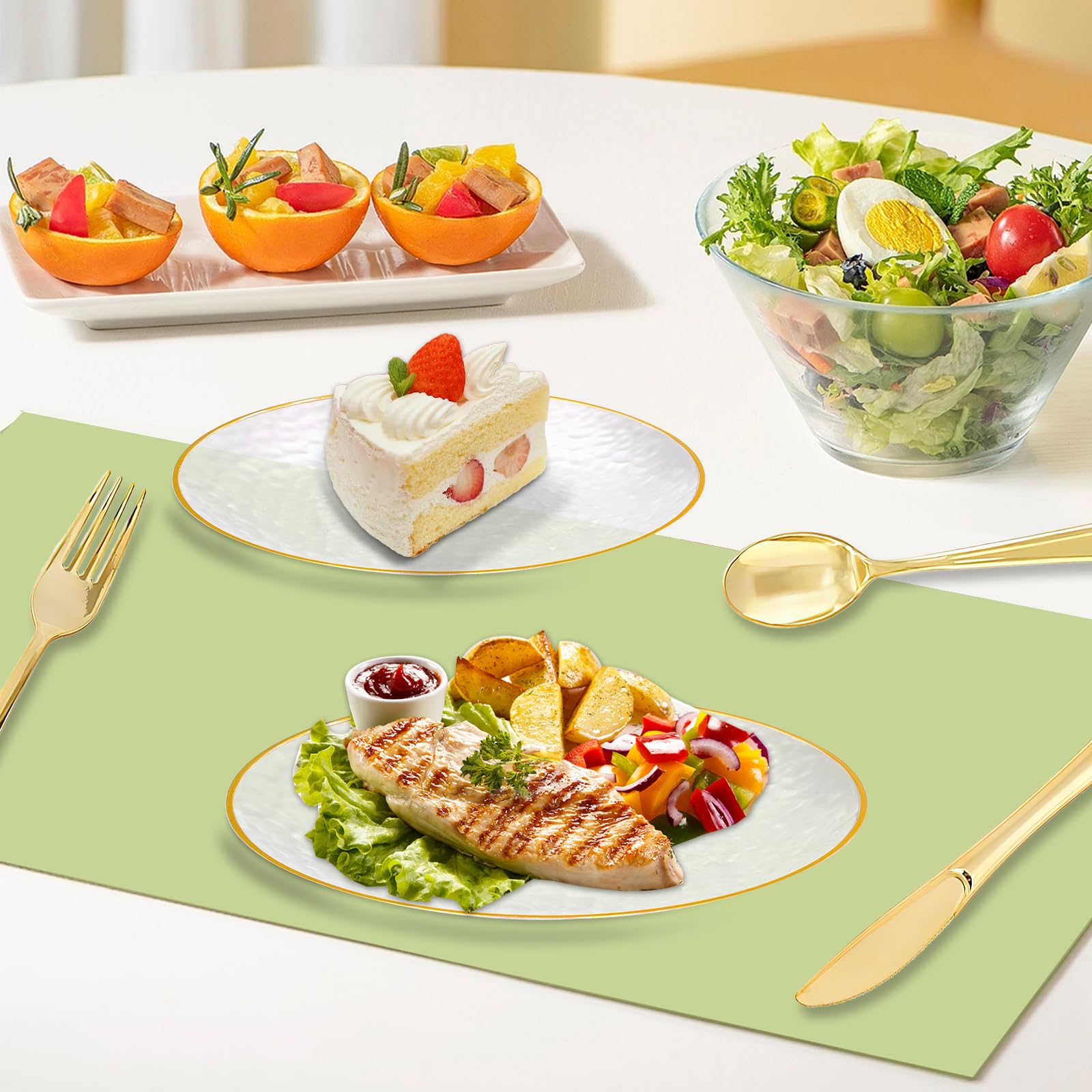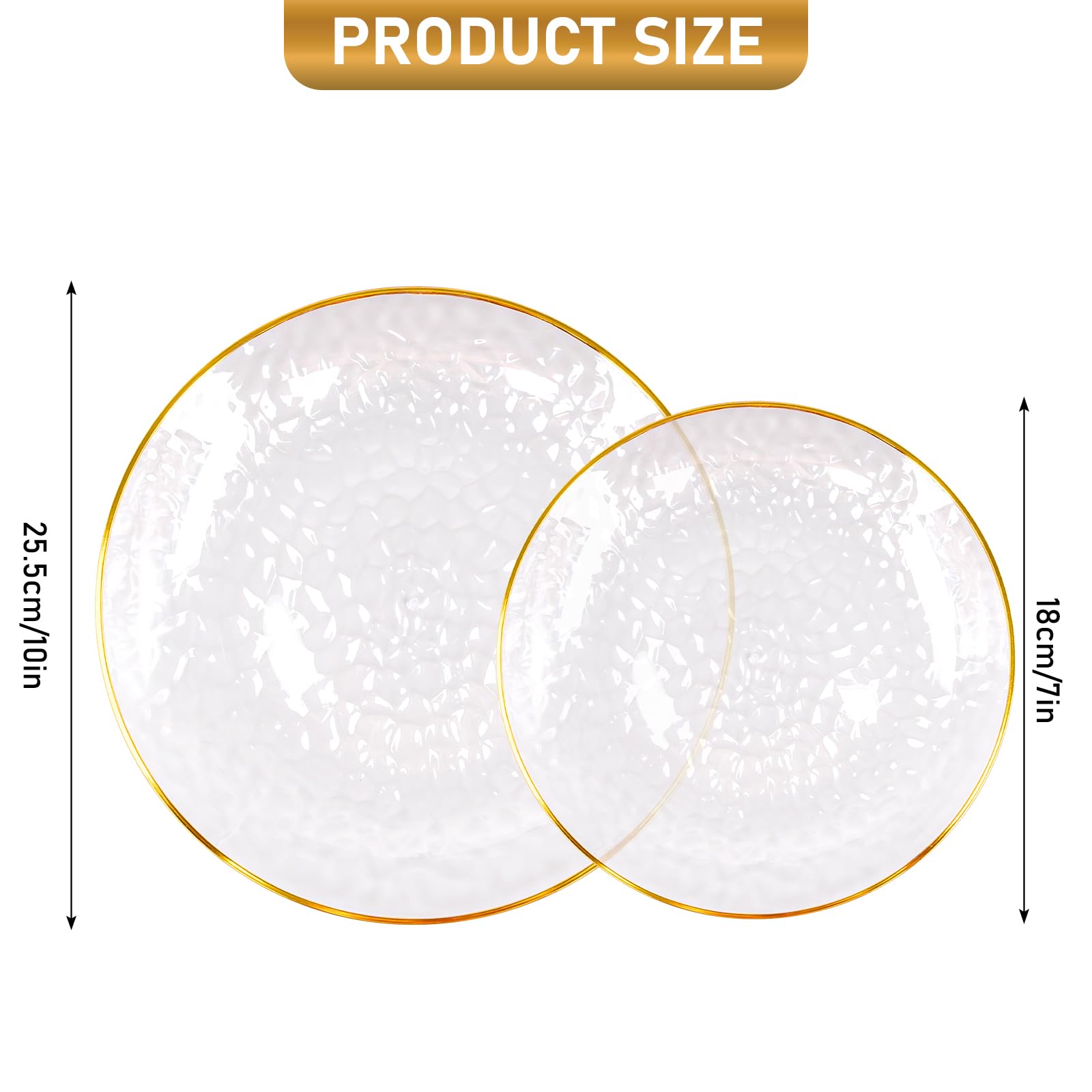 - Value Pack of 100: This set includes 50 large 10 inch gold hammered dinner plates and 50 small 7 inch clear plastic salad plates, providing you with everything you need for a complete meal. The generous quantity ensures that you'll have enough plates for large parties, events, or gatherings