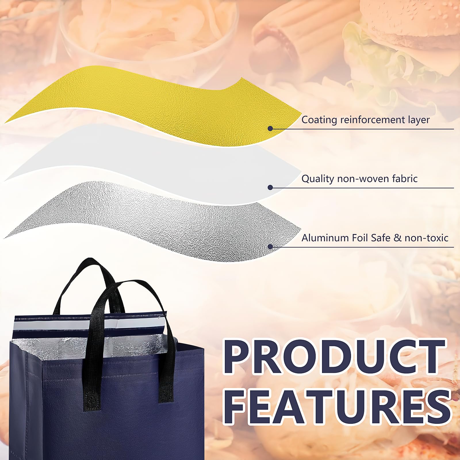- Versatile Usage -- These reusable lunch food bags are versatile and suitable for many occasions. Whether you need a bag to carry groceries, manage picnic essentials, or store perishables, these insulated food delivery bags work great to keep food fresh and warm. Perfect for restaurants, food retail stores, grocery shopping, picnics, lunches, beach trips, camping, and more