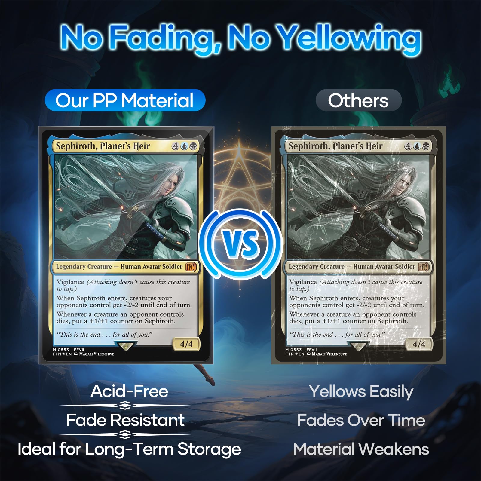 - 【Easy to Use - Widely Applicable】Our trading card sleeves size is standard(66×91mm), your cards are not easy to fall off. Whether it is organizing, collecting or protecting various cards, this card protector sleeves can easily cope with it. Suitable for MTG, Baseball Cards, Football Card, Sports Cards, making your collection more complete.