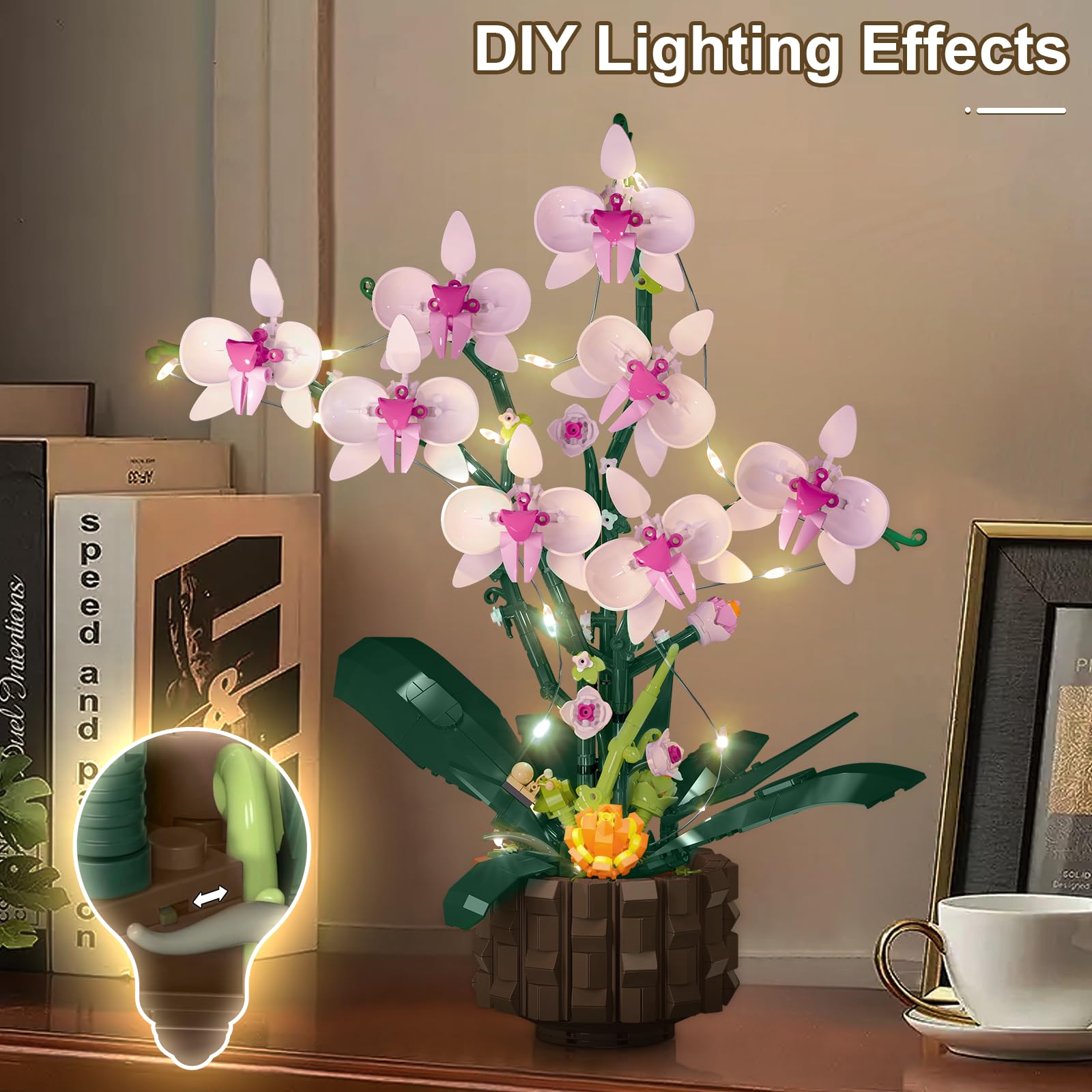 - Lighting Display Effect: Our orchid decorative blocks are equipped with a beautiful fairy light, which is cleverly connected to the flower pot. When lit at night, the flower interlocking blocks not only adds a soft glow to the orchid but also acts as a charming night light, creating a warm and romantic atmosphere for your space.