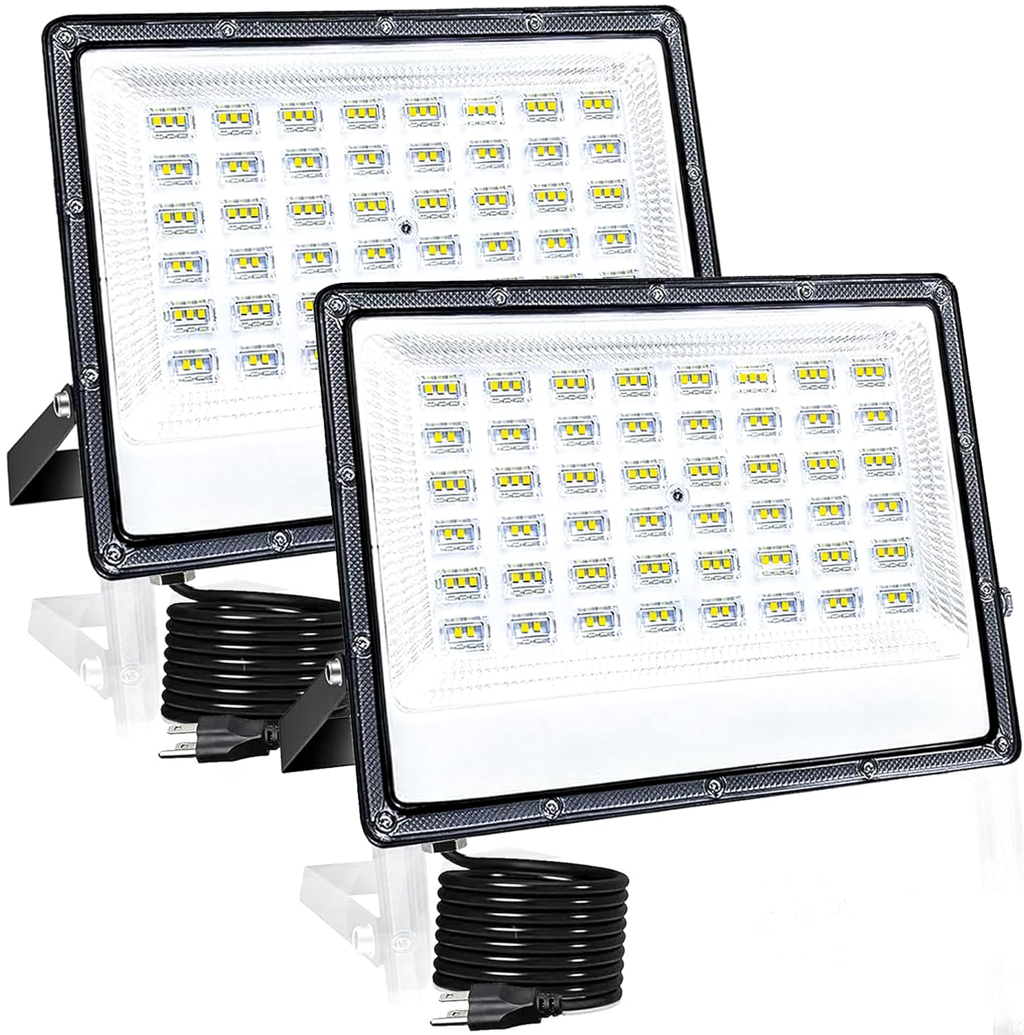 100W LED Flood Light Outdoor, 2 Pack 10000LM Super Bright LED Work Light with Plug, 6500K Daylight White Flood Lights Outdoor, IP66 Waterproof Exterior Floodlight for Garage, Yard, Lawn, Garden