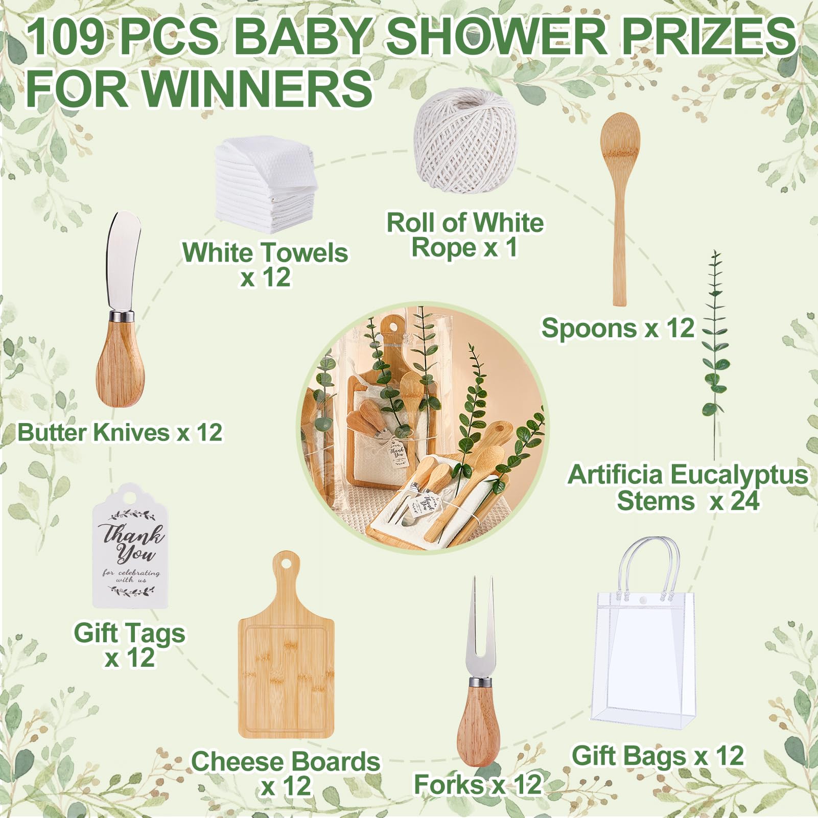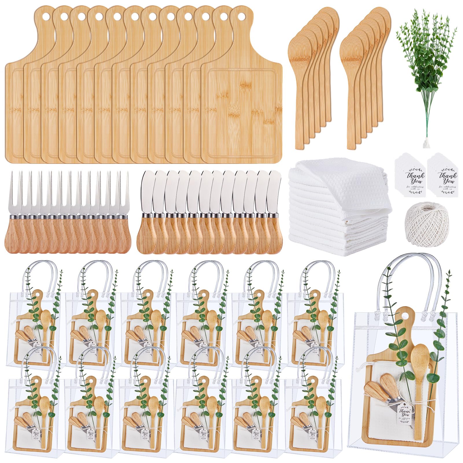 - All-Inclusive Surprise Gift Set: This 109-piece bundle includes 12 cheese boards, 12 spoons, 12 butter spreaders, 12 forks, 12 plaid towels, 24 artificial eucalyptus stems, 12 charming "Thank You" cards, 12 clear gift bags, and a roll of string. Perfectly curated for baby showers or bridal shower game prizes, it combines elegance and functionality to create thoughtful, memorable gifts for your guests