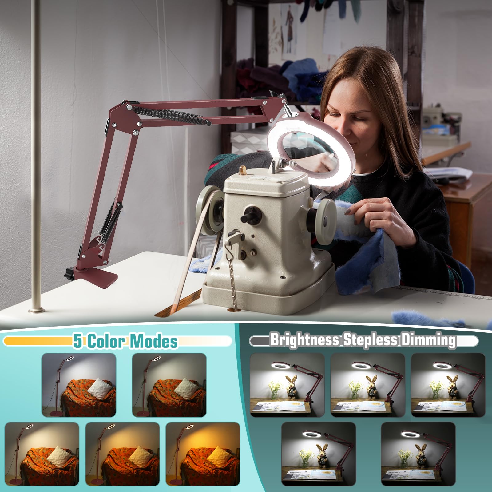 10X Magnifying Glass with Light and Stand, 3-in-1 Adjustable Swivel Arm LED Magnifying Floor Lamp, 5 Color Modes Brightness Stepless Dimming Lighted Magnifier Hands Free with Clamp for Crafts - Red