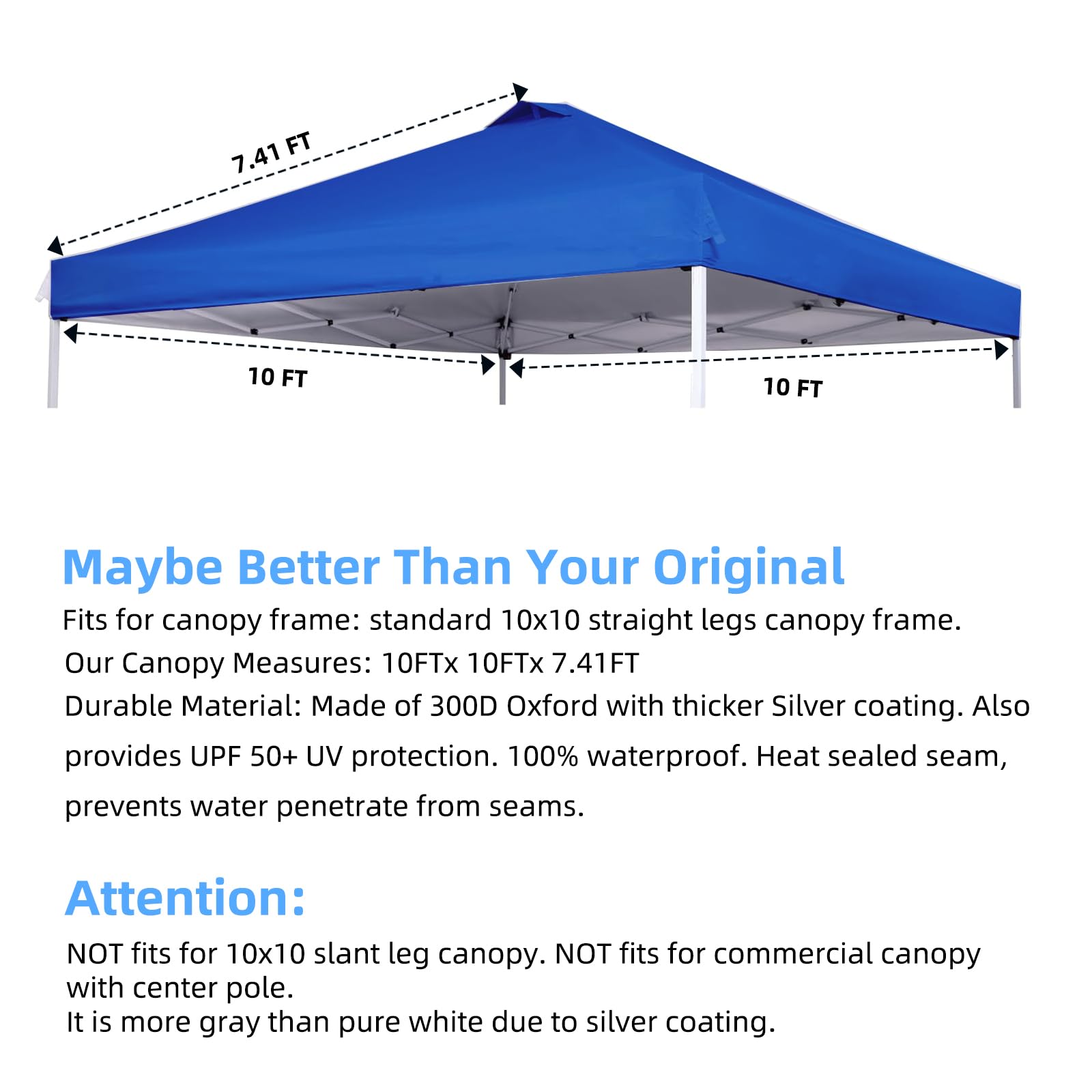 - [Fit SIZE] - Our canopy replacement top will fit most 10x10ft canopy with straight legs, NOT fit any canopy with slant legs. And is a ideal choice for replacing damaged tops or purchasing as a backup. This canopy top measures 10' W x 10' D x 37" H.(when placed on the canopy frame) Please accurately measure your frame to be 10x10FT before purchasing