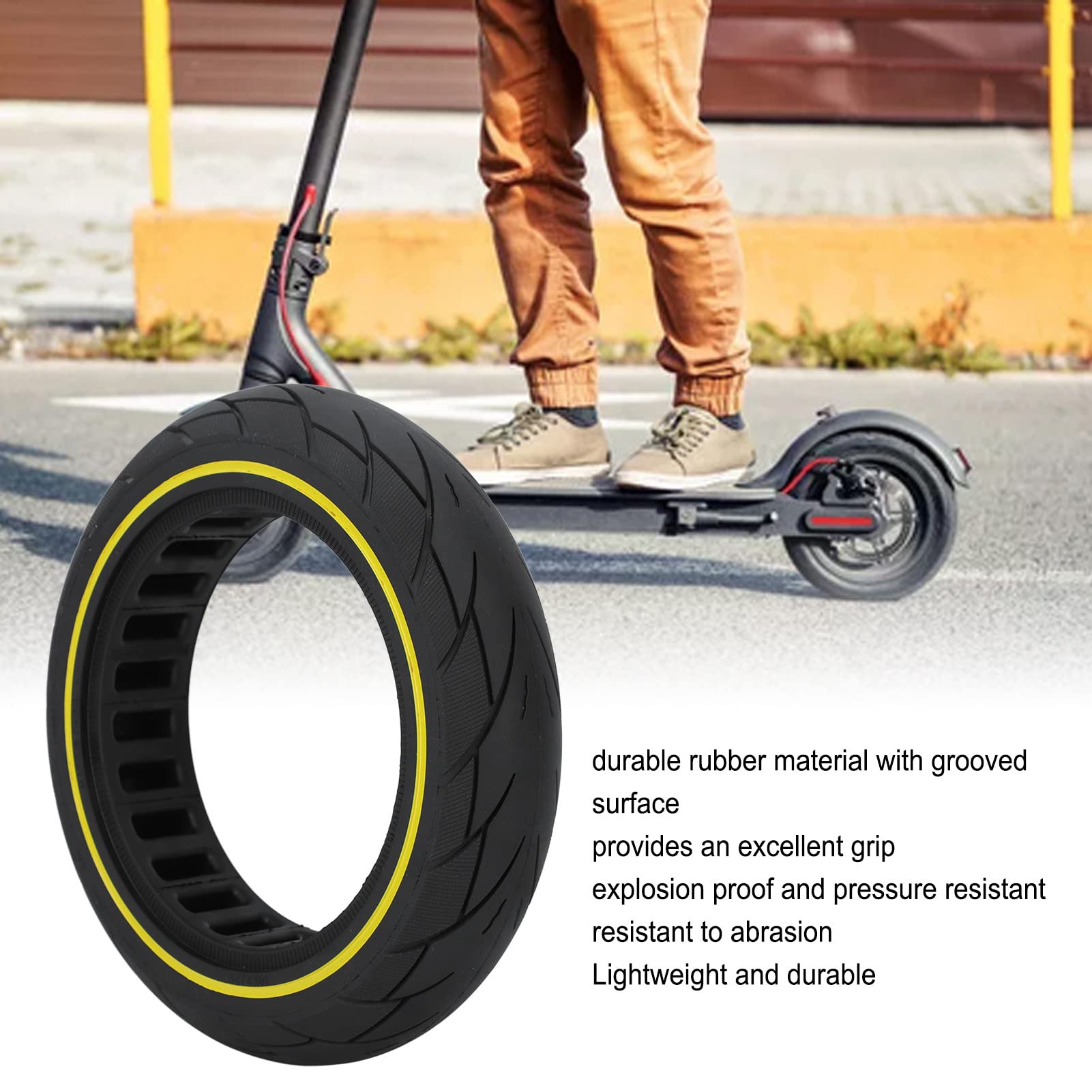 - Rubber Material: Electric scooter tire is made of rubber material, wearproof and tasteless, with nonslip design, internal honeycomb shock absorption design, external honeycomb dot design, beautiful and generous.
