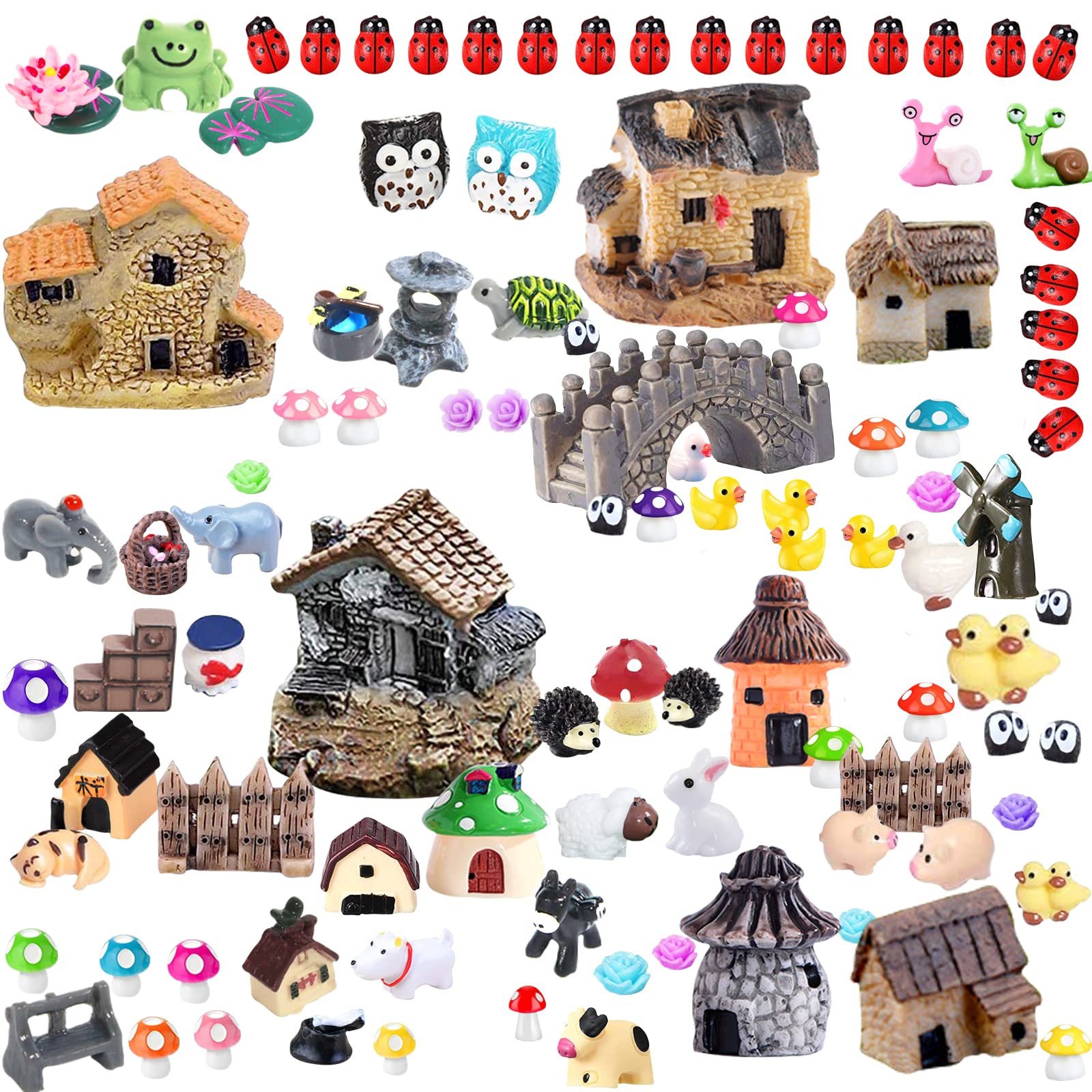 - Package Include: fairy garden kit includes 31 x ladybugs, 20 x big mushrooms, 10 x flowers, 4 x ducks, 5 x briquette, 7 x stone houses, 2 x owls, 2 x snail, 1 x sheep , 1 x small eared rabbit,1 x mushroom house, 1 x bridge, 3 x elephant decor, 3 x frog decor, 3 x hedgehog decor, 3 x cat decor, 3 x donkey decor, 3 x tortoise decor, 3 x cow decor, 3 x dog decor, 3 x pig decor, 3 x duck decor , the quantity is sufficient.