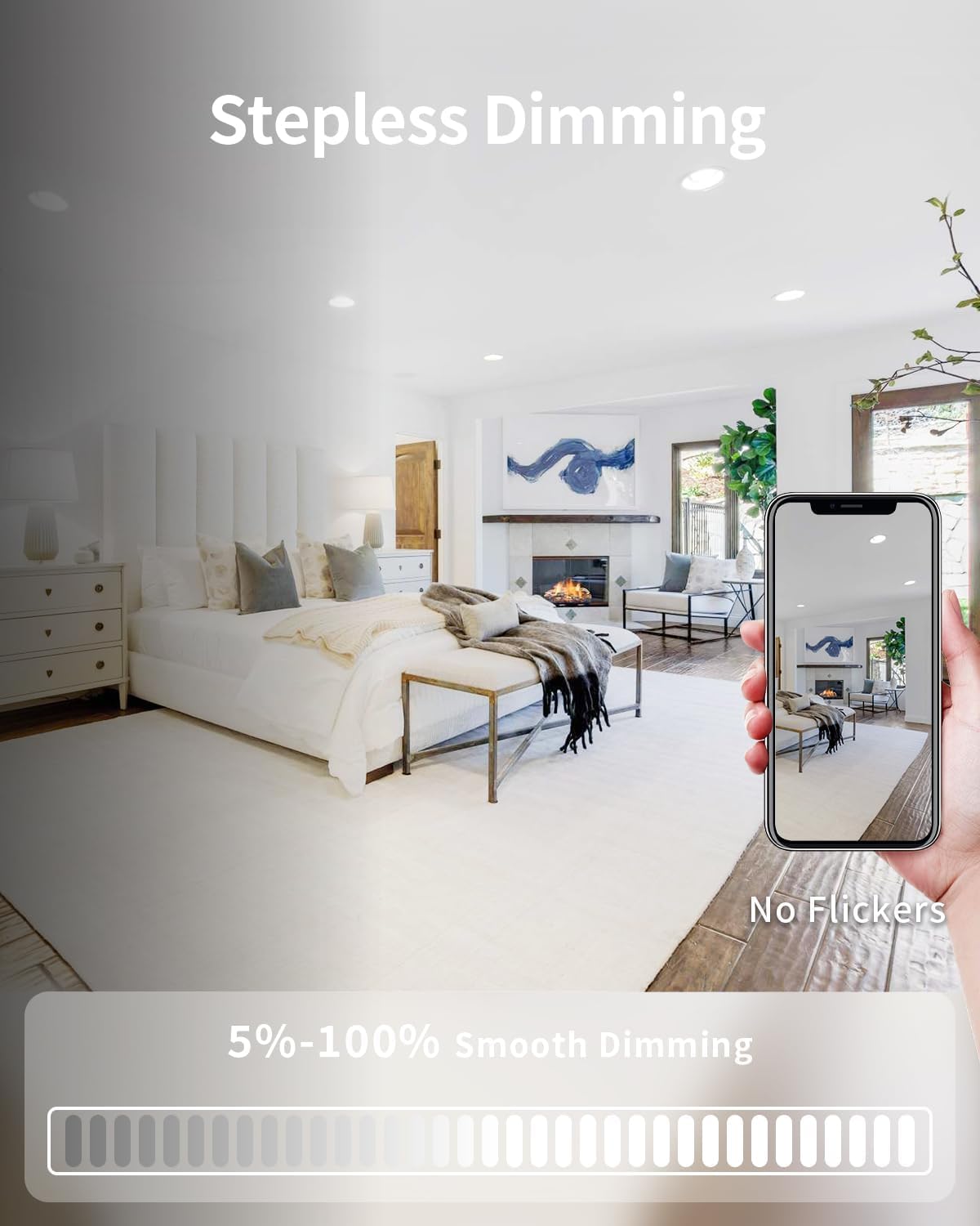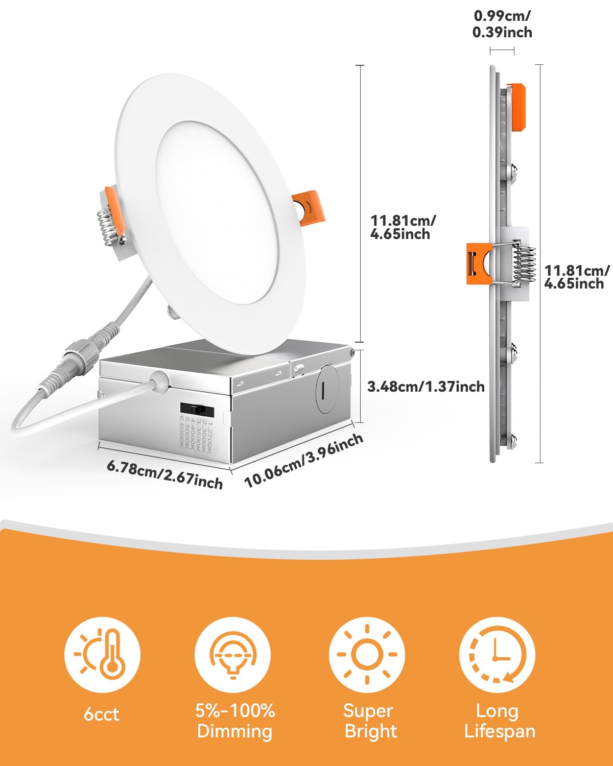 - 【Wide Application】Ultra-thin body, 5%-100% smooth dimming, compatible with most dimmers, damp location approved, meets kinds of needs in applications such as kitchen, living room, bedroom, bathroom, workplace, outside soffits and other hard to reach spaces.