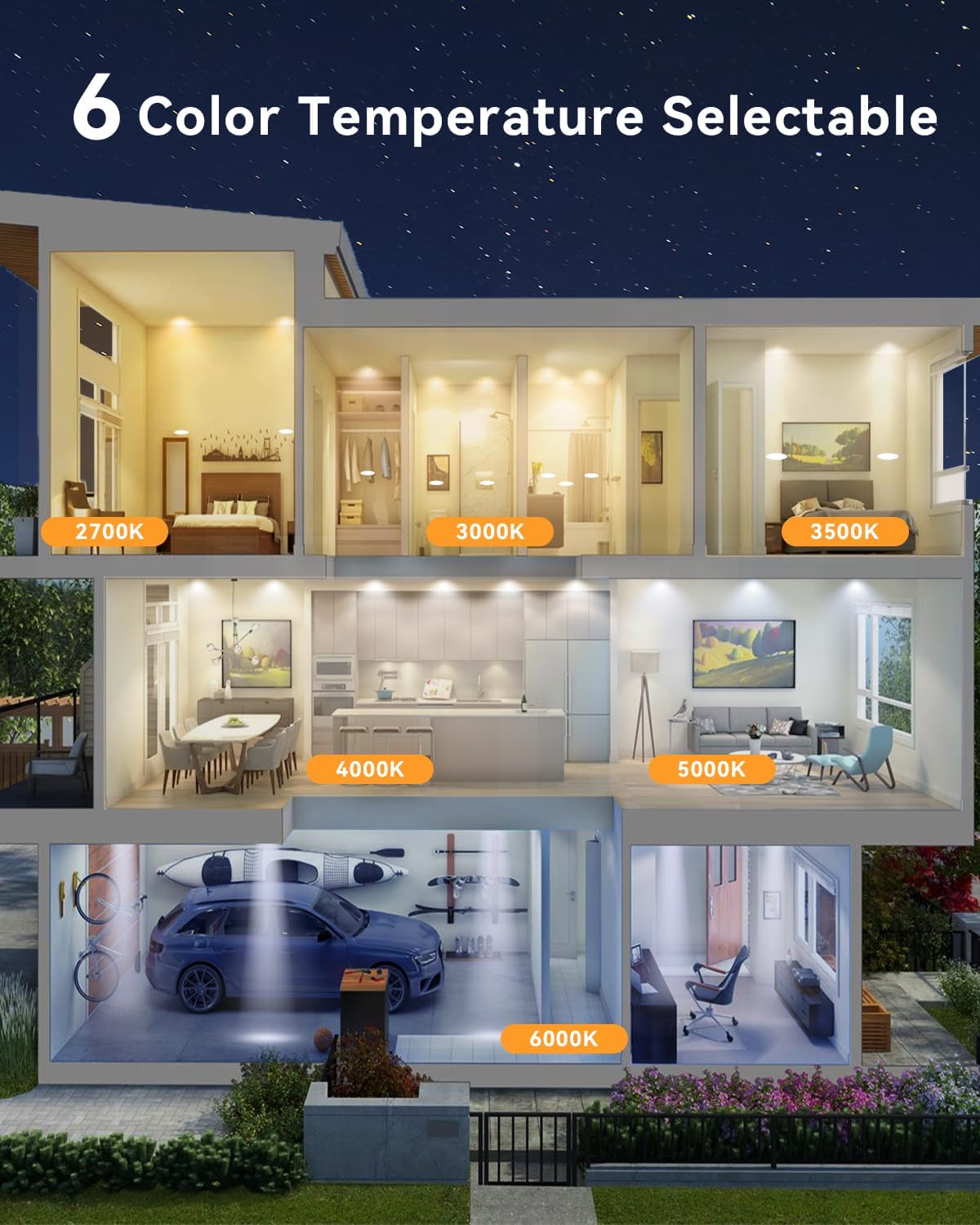 - 【6 CCT in 1】6 color temperature recessed lights (2700K/3000K/3500K/4000K/5000K/6000K)Multiple color temperature mode you need, slide the switch on the side of the junction box, you can get the suitable for your room lighting atmosphere.