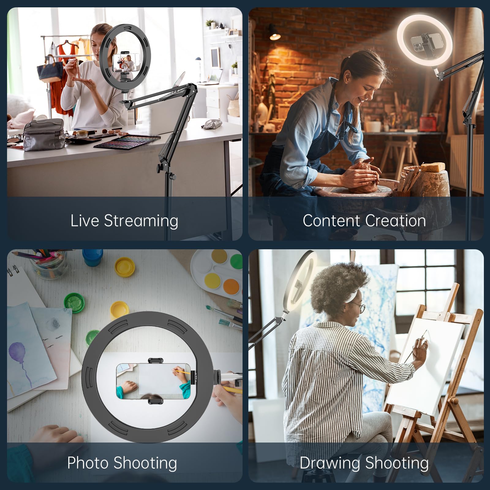 - Effortless Setup & Flexible Height: First-time users can assemble this standing ring light tripod in just 3 minutes: simply connect the base, stand, cantilever, and light in sequence, then tighten. Adjust the shooting height from 45 to 72 inches to nail overhead shots or varied angles with ease, ensuring your ring light for phone or camera is always positioned perfectly.
