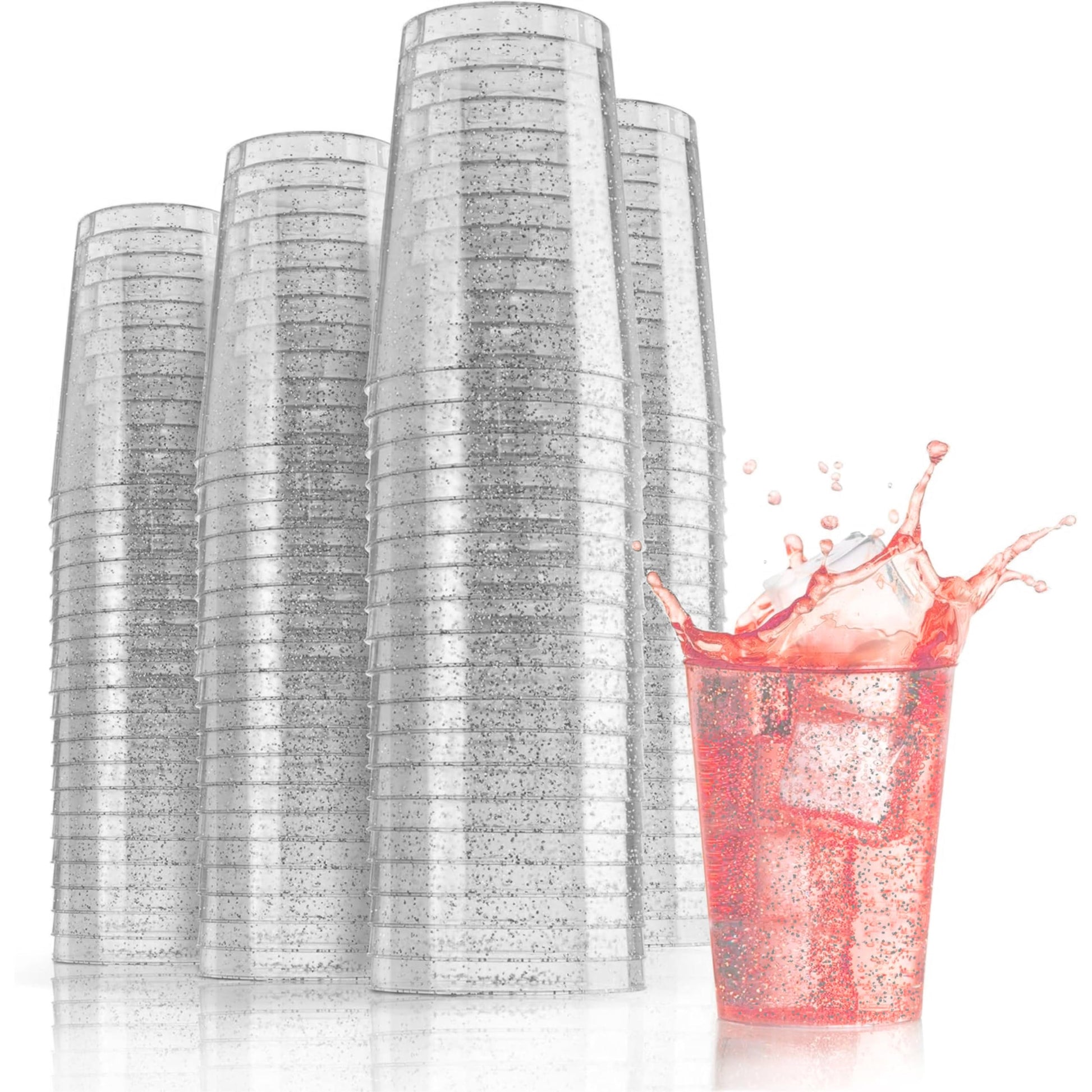 - Includes: Our clear party cups come in a 120 pack of 10 oz silver glitter clear plastic cups tumblers that are perfect as plastic wine glasses for any occasion. Measuring 3 inch wide at the top 2 inch wide at the base and 3.8 inch tall. Their hard structure assures a delightful experience whatever the beverage.