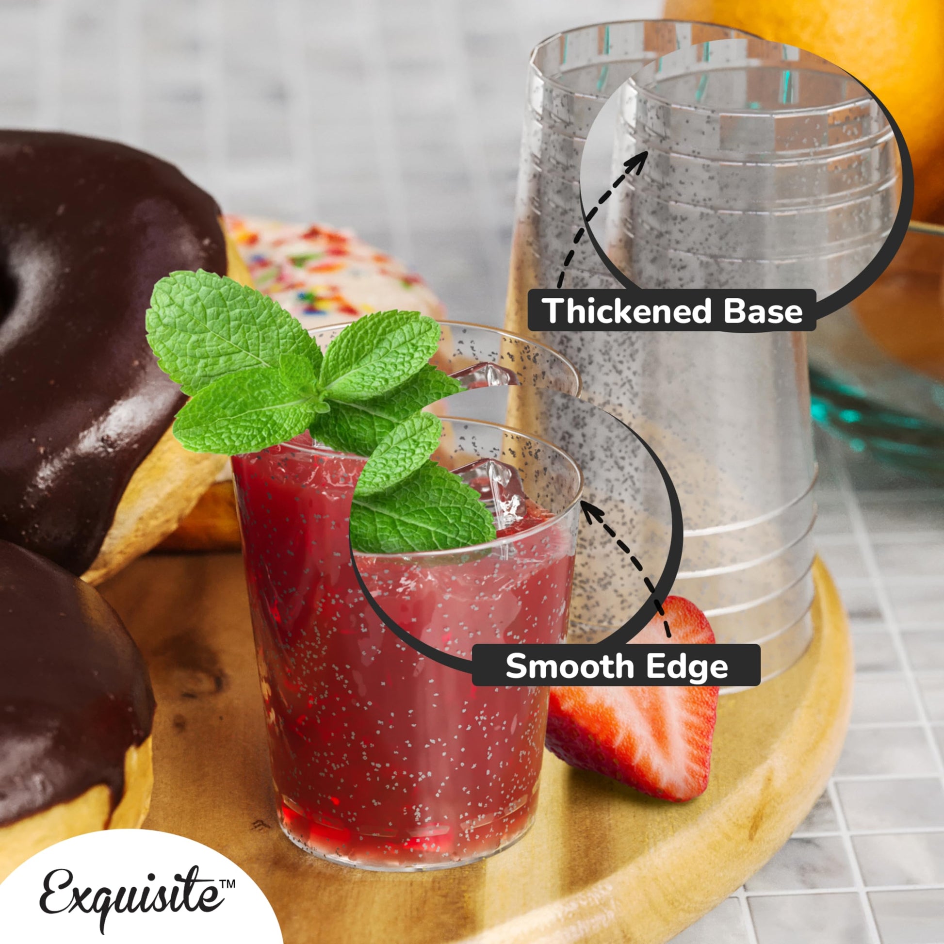 - Design: These plastic tumbler cups were designed as clear and silver plastic cups. Being see through yet adding a pinch of sparkles, they bring a touch of elegance to any event. This elegant design makes our clear cocktail cups the ideal plastic party cups for any occasion