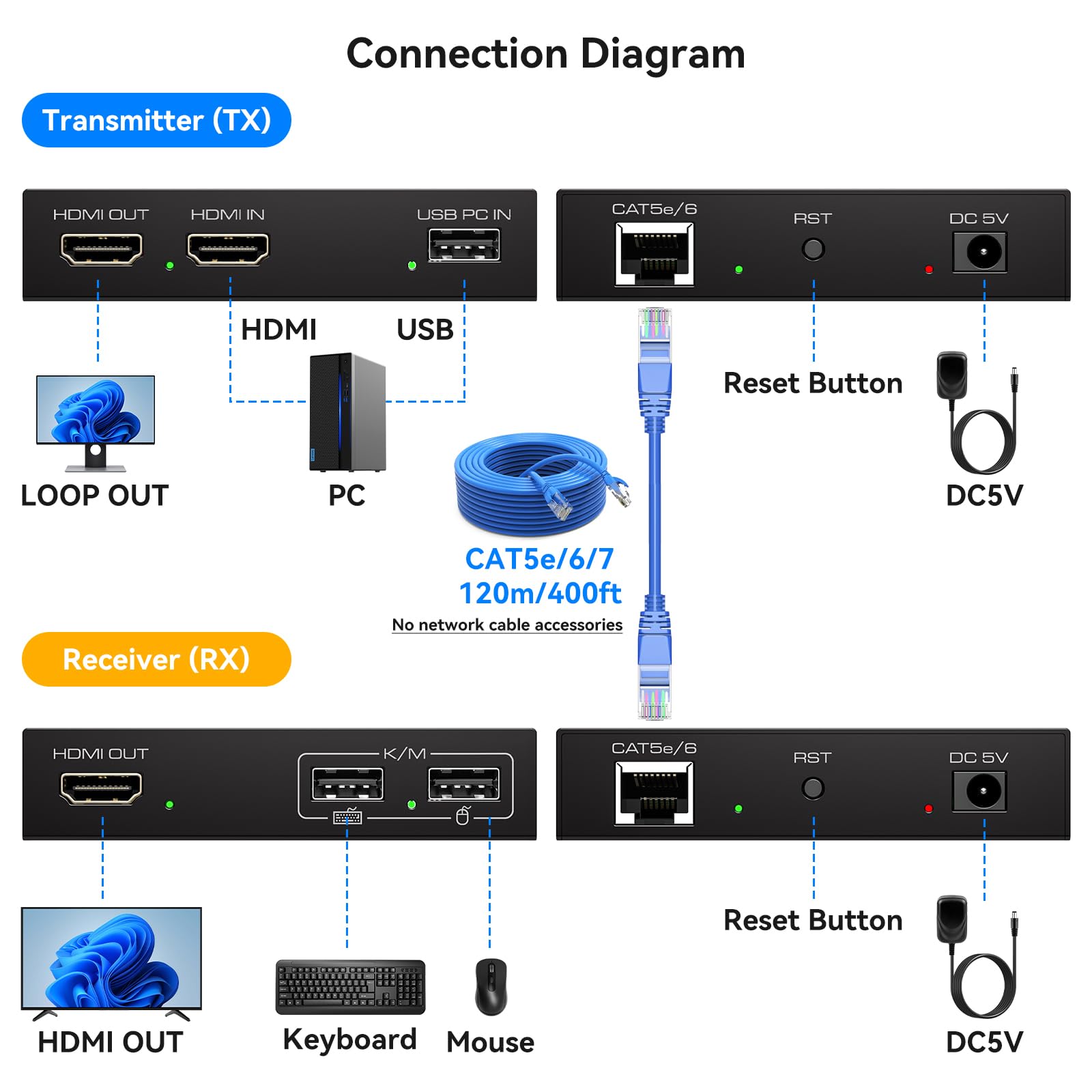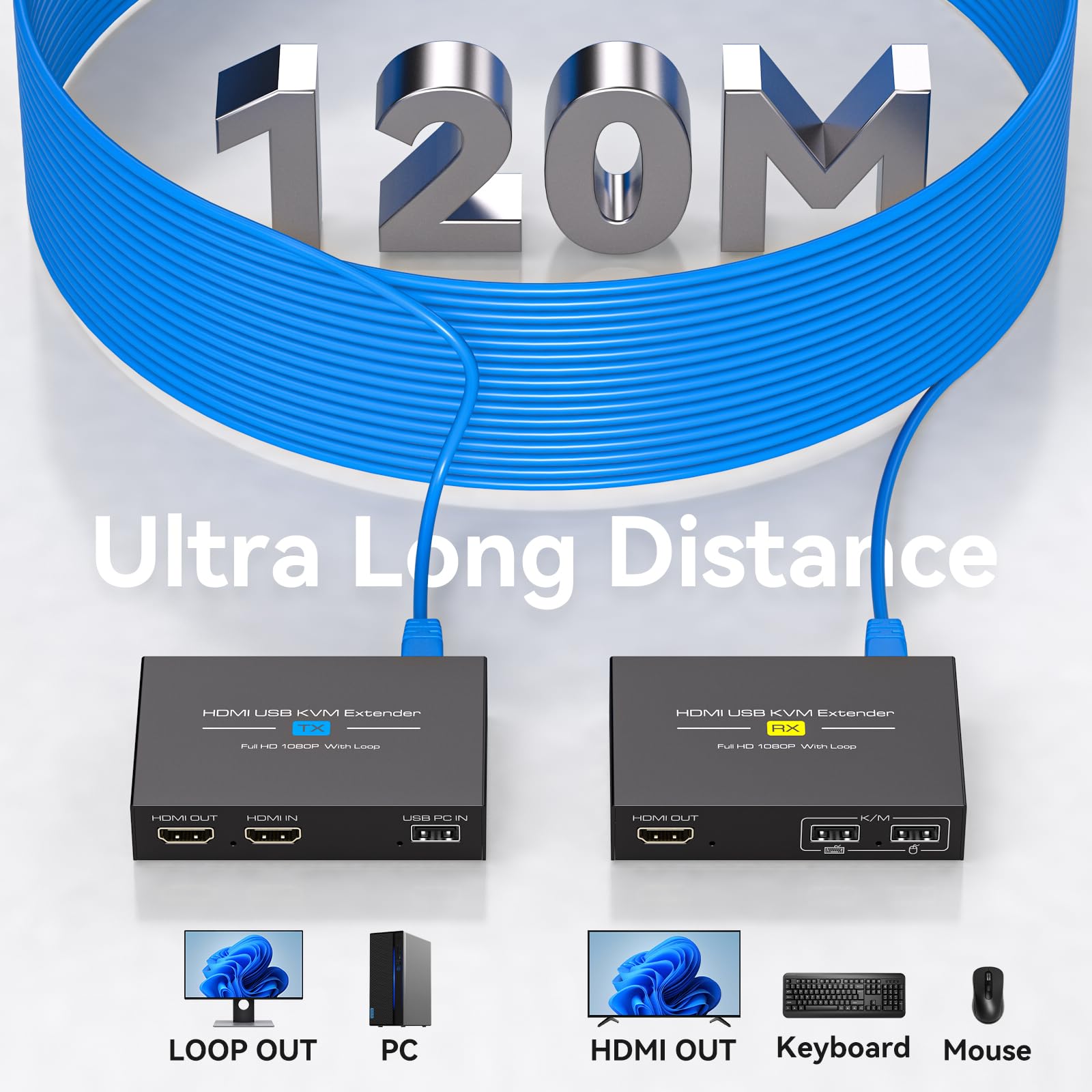 120M 394ft HDMI KVM USB Extender Over Cat 5e 6 71080P Ethernet Balun Transmitter Receiver with Loop Out Function Plug Play for Mouse and Keyboard Control