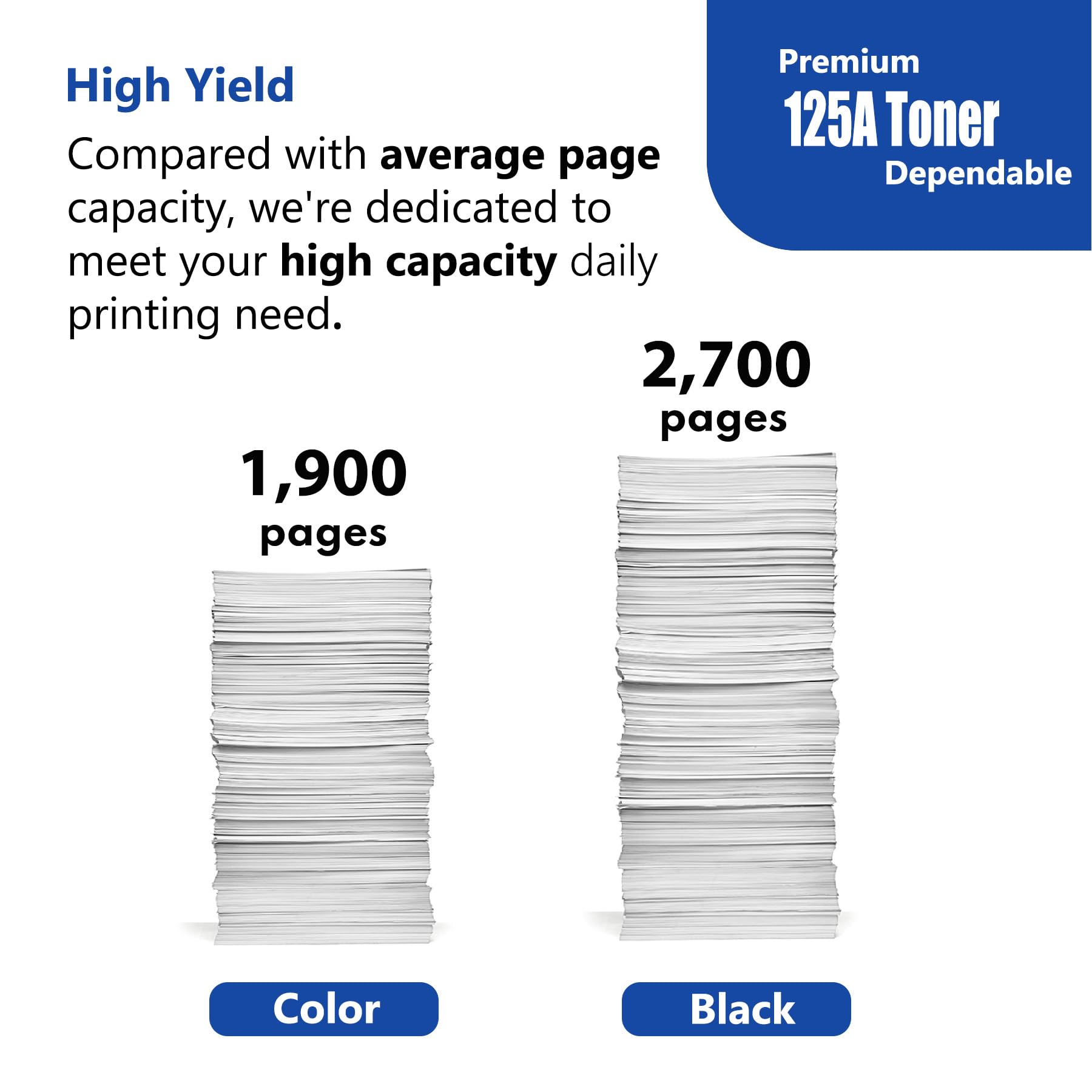 - Page Yield: Up to 2,700 Pages for 125A Black Toner Cartridges, 1,900 Pages for 125A Color Toner Cartridges (Letter A4, at 5% coverage)