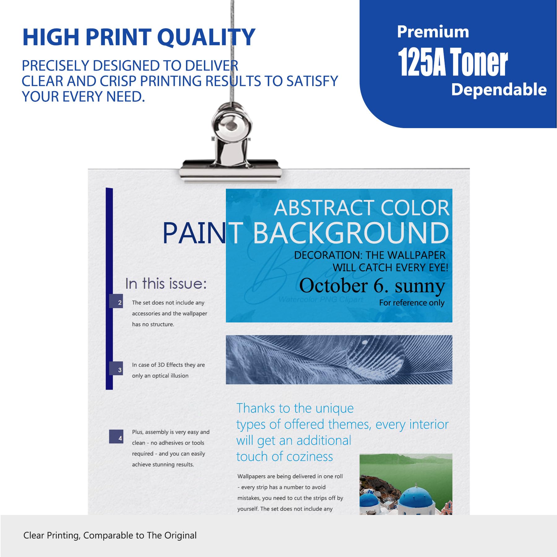 - Built-in chip: to provide you with a hassle-free printing experience, to solve your removal and installation of the old chip trouble, more convenient and quick replacement 125A toner cartridge