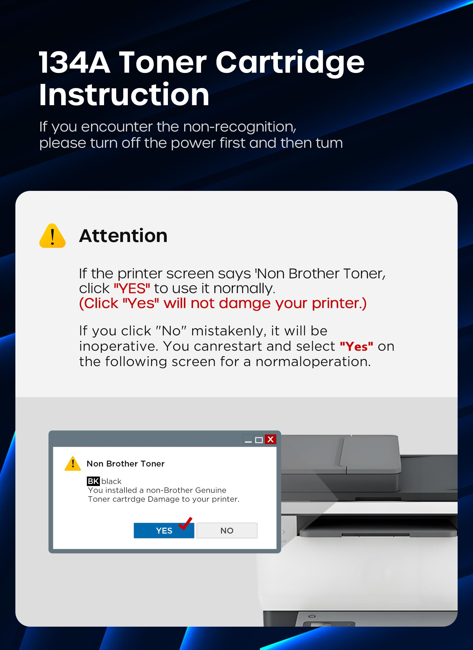 - Package Included: 2 x 134A Black Toner Cartridge (with Chip), 1 x User Instruction Card