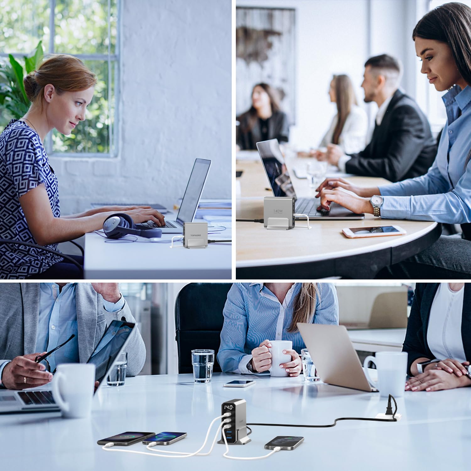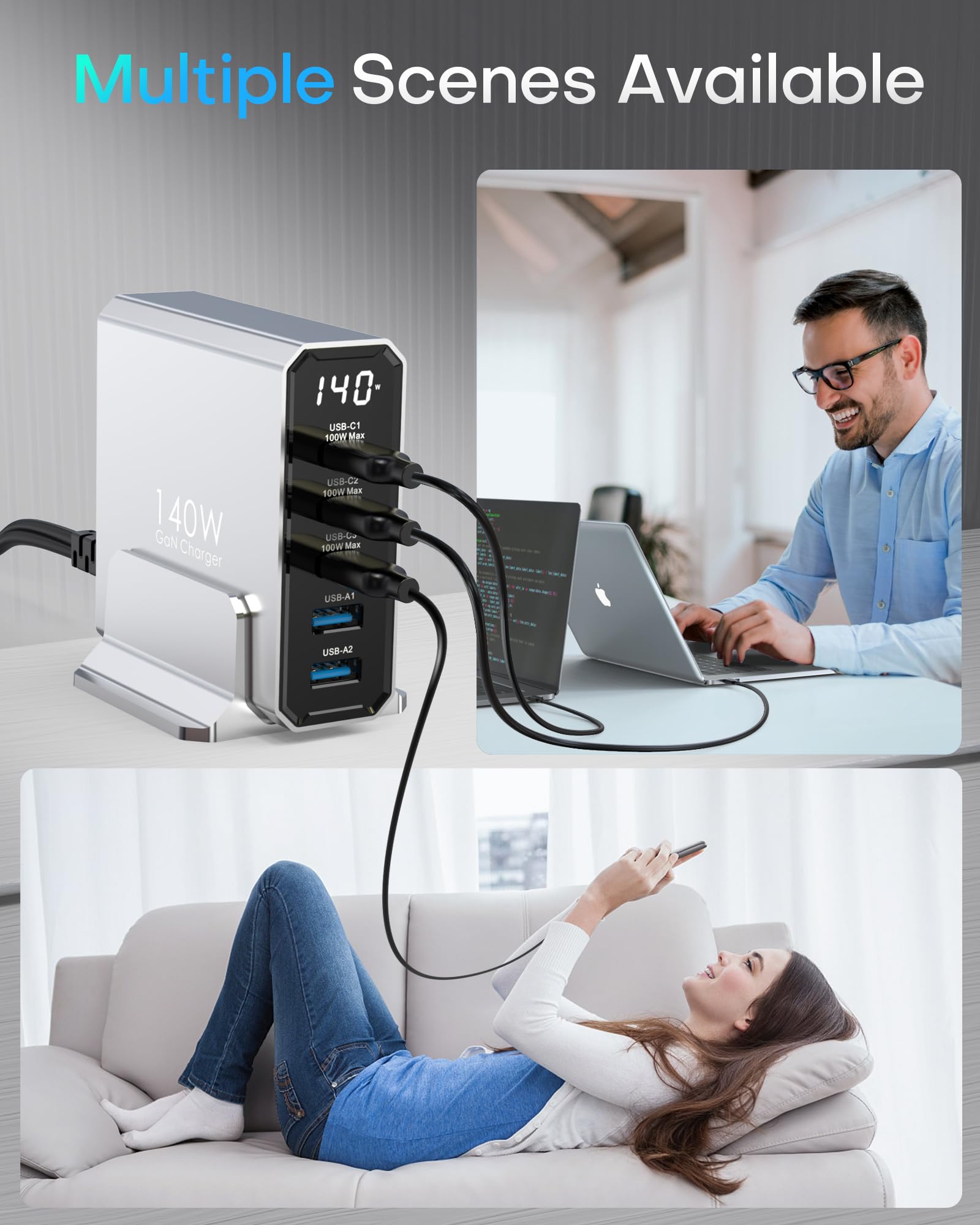 - 5 in 1 USB-C Charging Station: This multiple charging station features 3 USB-C ports (a maximum power of 100W each) and two USB-A ports (a maximum power of 60W each), for a total power reaches 140W. Purchasing this product is equivalent to acquiring 5 high-power fast charger block simultaneously, not to mention bidding farewell to tangled USB cables and cluttered charger.