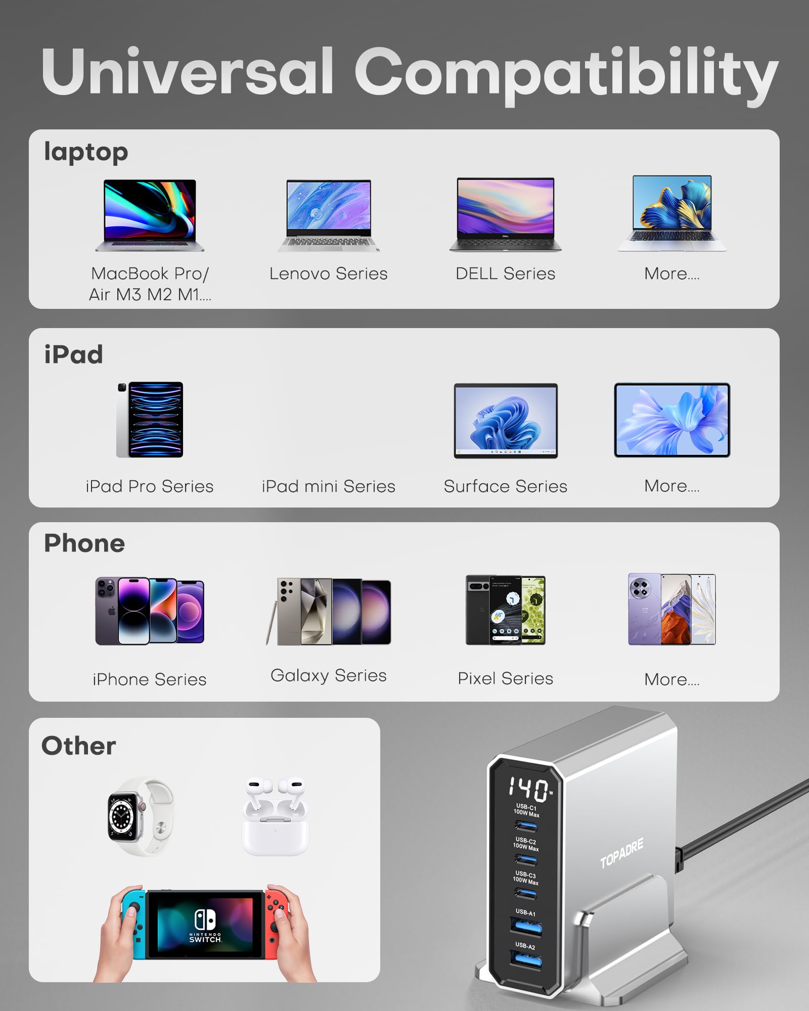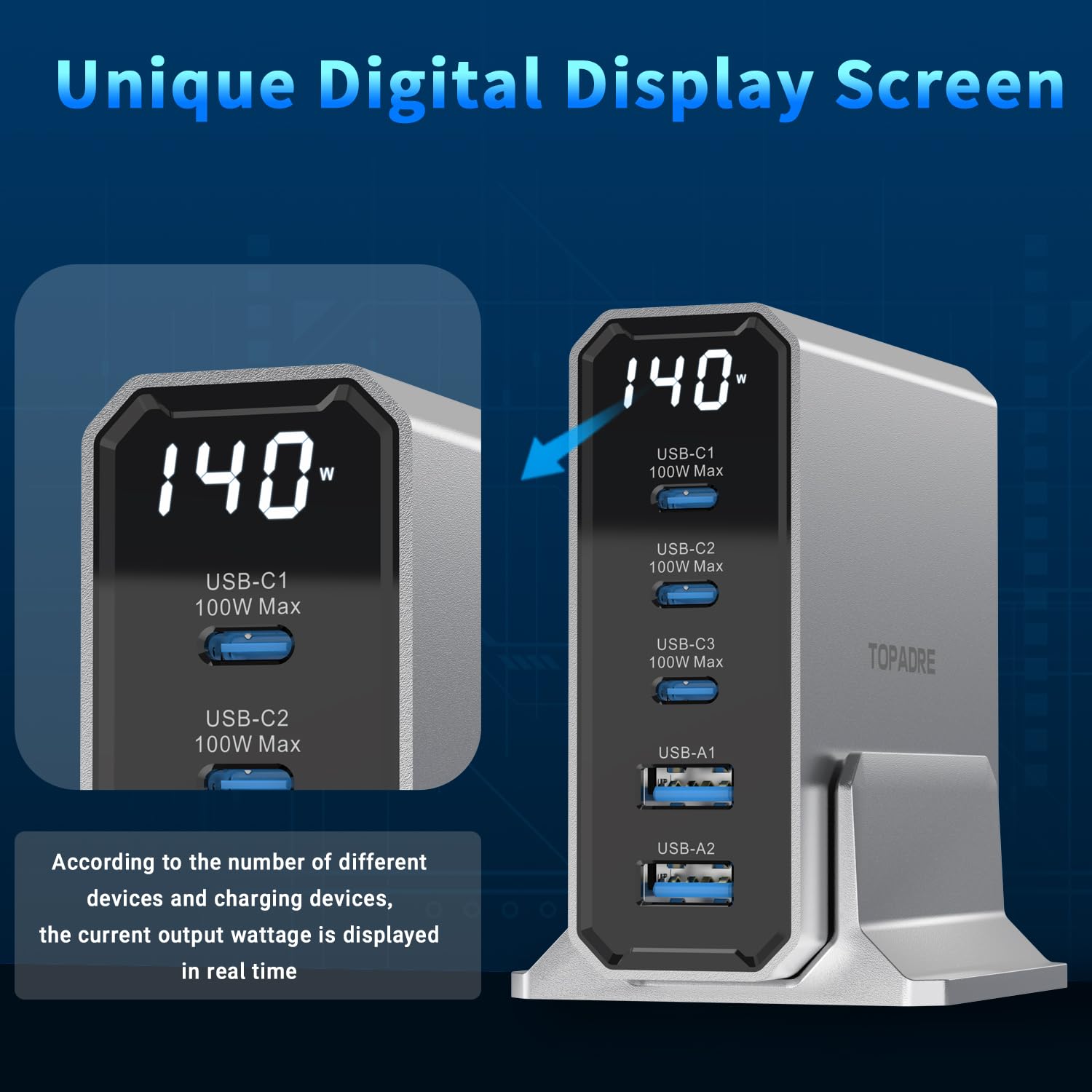 - Brand Service and Commitment: Inside the package, you'll find the 140W multiple charging station, a 5-ft detachable power cord, and a desktop stand. TOPADRE promises a 24-month warranty and is committed to providing customer service at any time. If you encounter any issues, please feel free to contact us, and we'll respond within 24 hours!