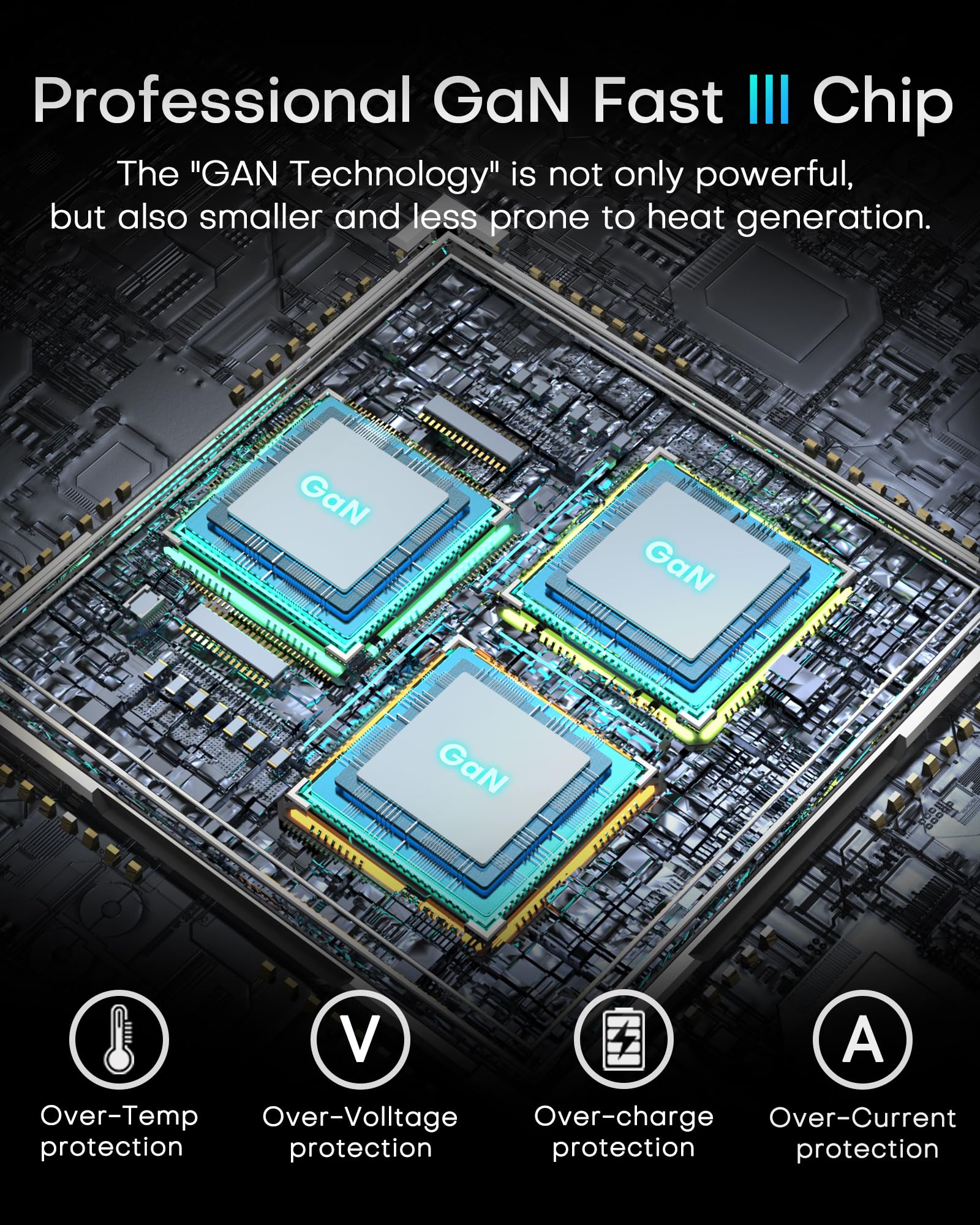 - Powered By GaN III Pro: Utilizing upgraded advanced Gallium Nitride (GaN) technology, this fast USB C charger block reduces power waste and heat by 30%, ensuring normal temperature even during full-power operation.