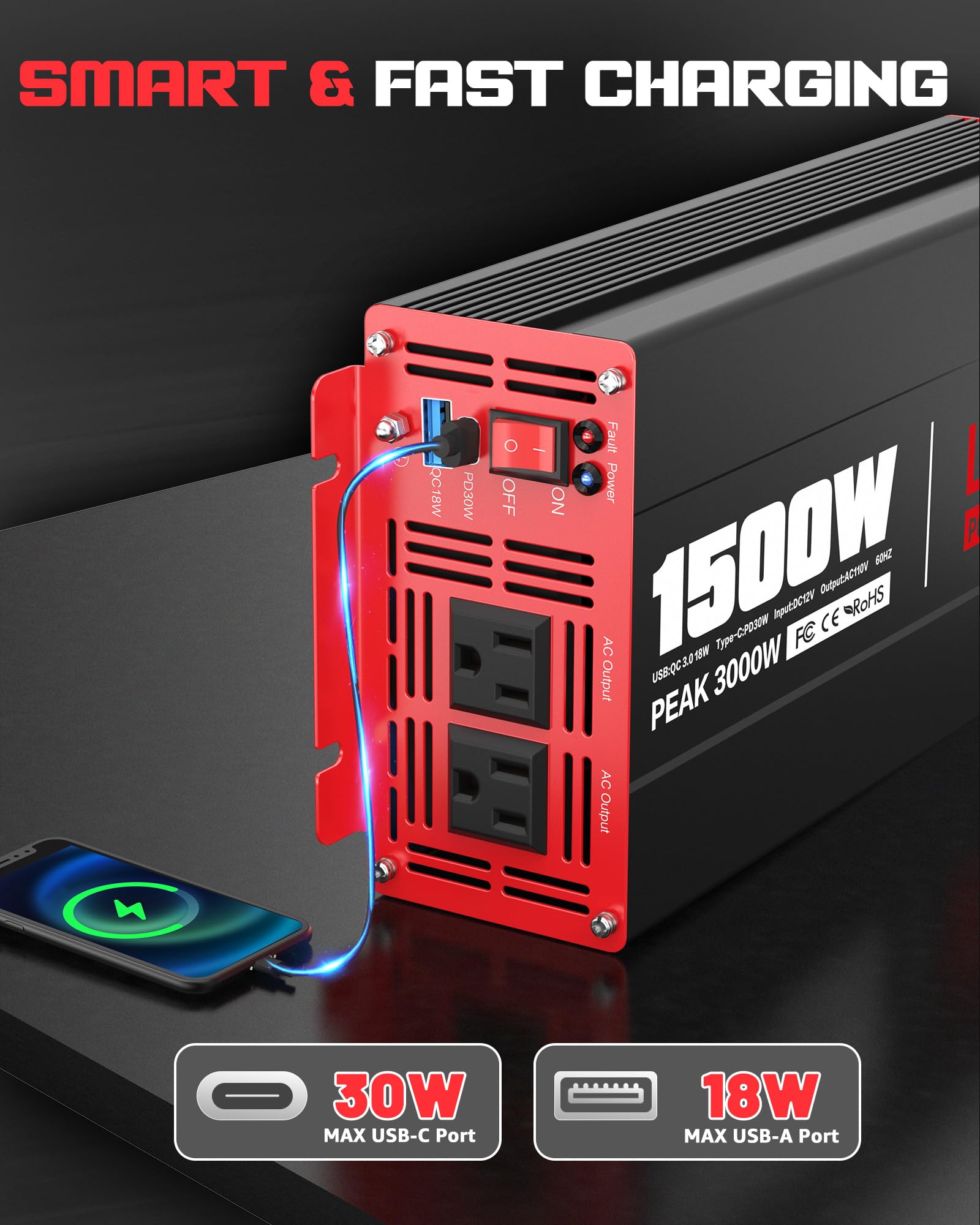 - 1500W POWER INVERTER ---- LCYMW Modified Sine Wave Power Inverter delivers steady 1500W continuous DC to AC power (12V to 120V), with 3000W peak surge capacity—perfect for running devices during road trips, camping, storms, or power outages. Built with high-frequency transformers and pure copper cables for safe, stable performance.