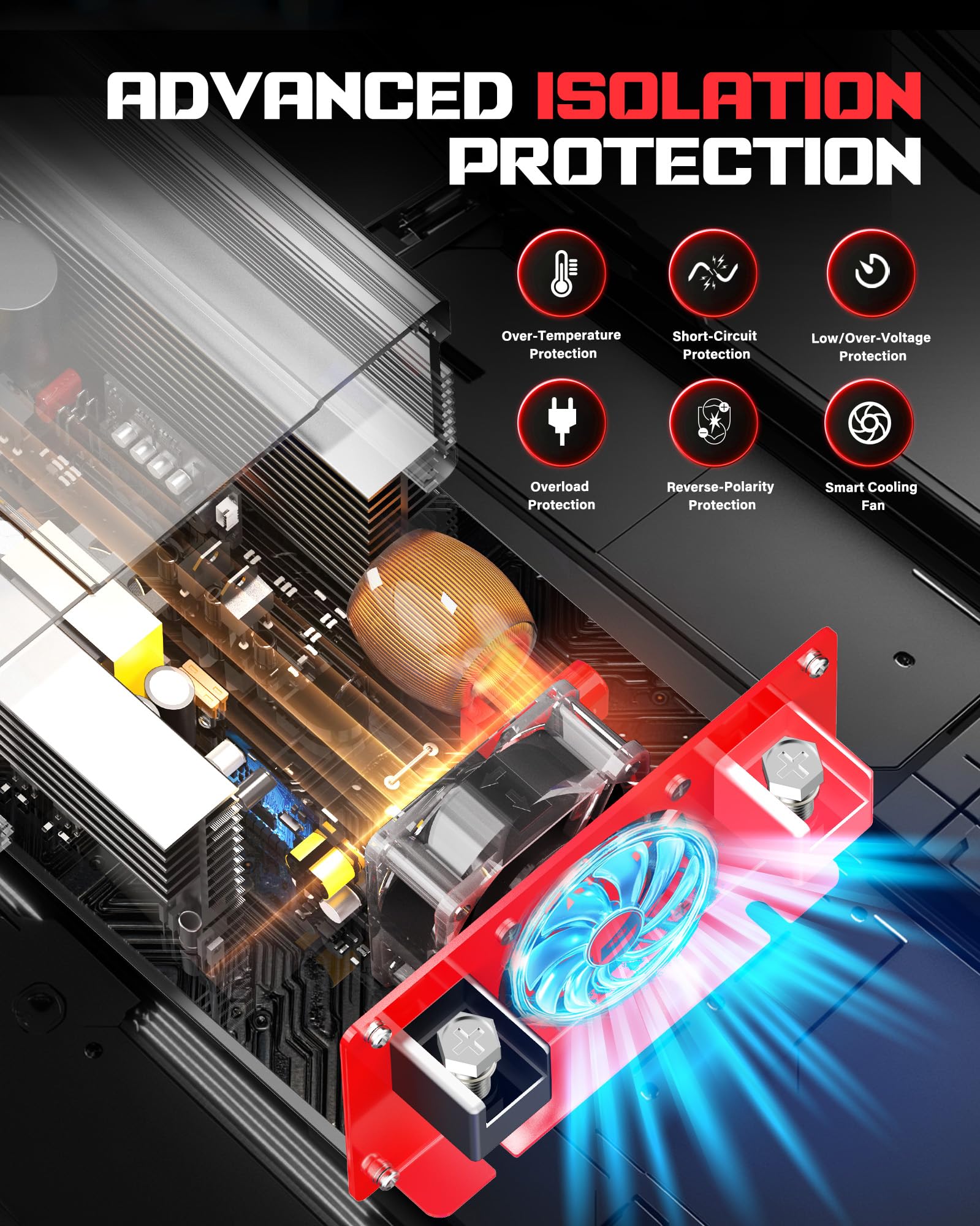 - COMPREHENSIVE PROTECTION MECHANISM ---- Isolated Voltage Protects Perfectly for your device from Over-voltage, Under-voltage, Overheat, Overload, Reverse Polarity, Short circuit. These intelligent safety features ensure the device operates safely under various conditions while effectively extending the inverter’s lifespan.