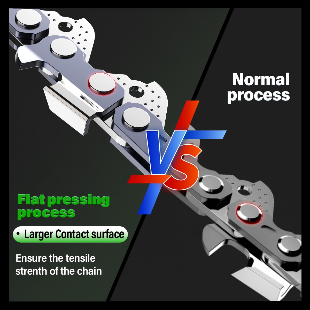 - Low Kickback Design for Enhanced Safety: To prevent safety hazards caused by "chain kickback," TapVolx chainsaw replacement chain use a flat rivet process that increases the contact surface, making the chain less likely to break. With a tensile strength up to 7000 N.m, which is 20% higher than similar chainsaw blade, this design significantly reduces the risk of kickback and provides users with a safer operating experience.