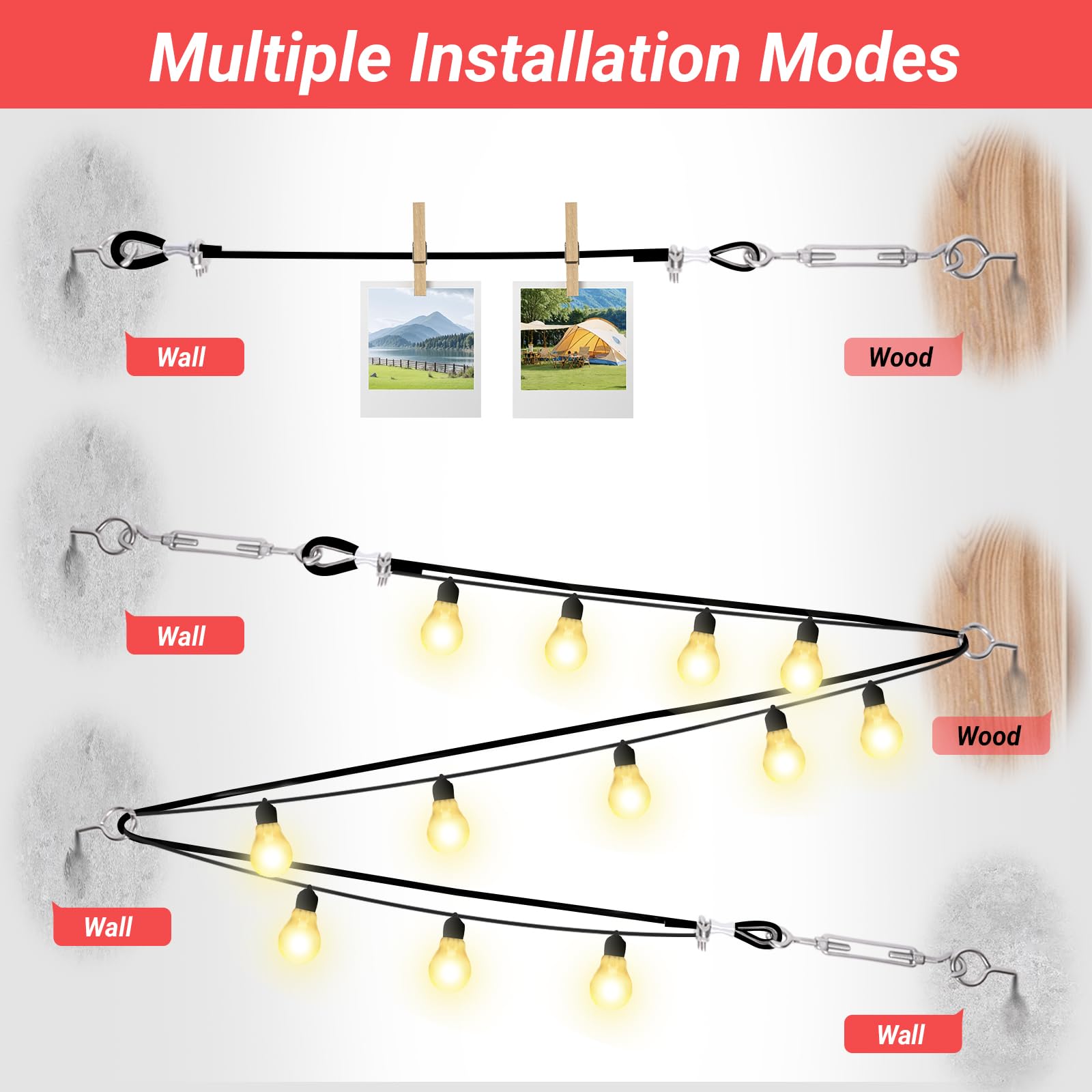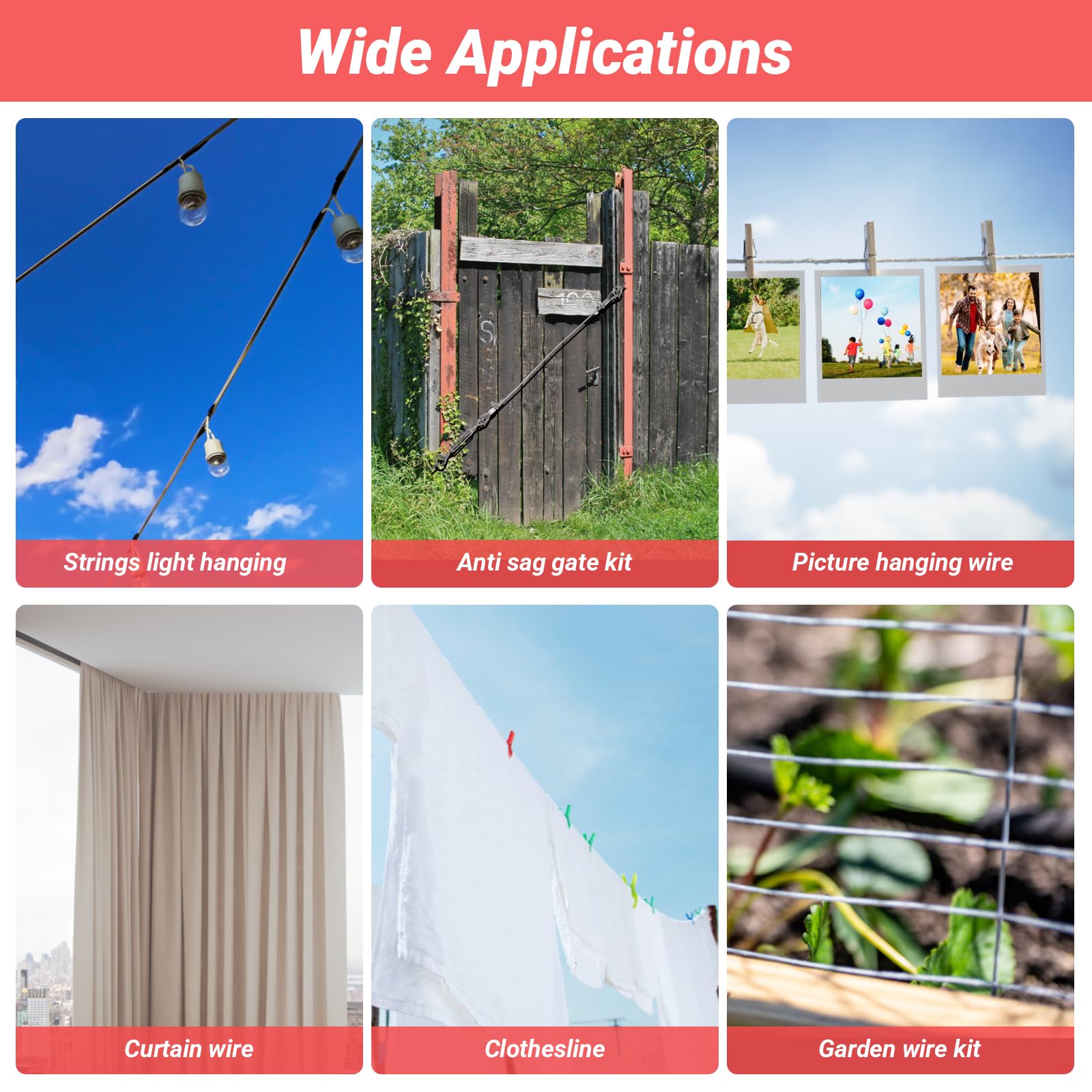 - 【Wide Application】Wire rope kit is widely used for wire rope applications and anything else that requires strong cable, like hanging string lights for a romantic party, patio, backyard, garden, or porch. It's great for trellis wire kits, plant climbing kits, outdoor cable railings, wire railing kits, picture hanging, clothesline cables, and more hanging needs.