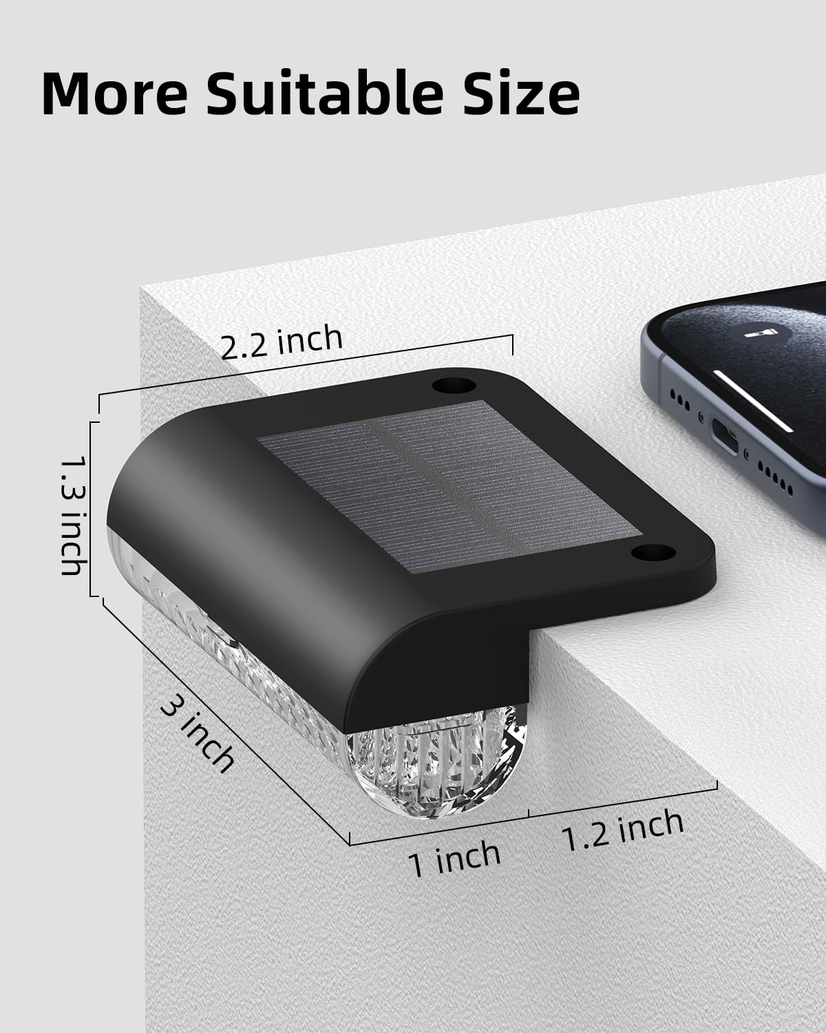 - Small and Bright:Create staircase safety with solar step lights,perfectly illuminating pool decks, garden pathways, and wooden patio stairs. The low-profile design (3”L x 2.2”W) casts glare-free lighting to enhance outdoor aesthetics without light pollution. Ideal for vinyl railing or concrete step edges.