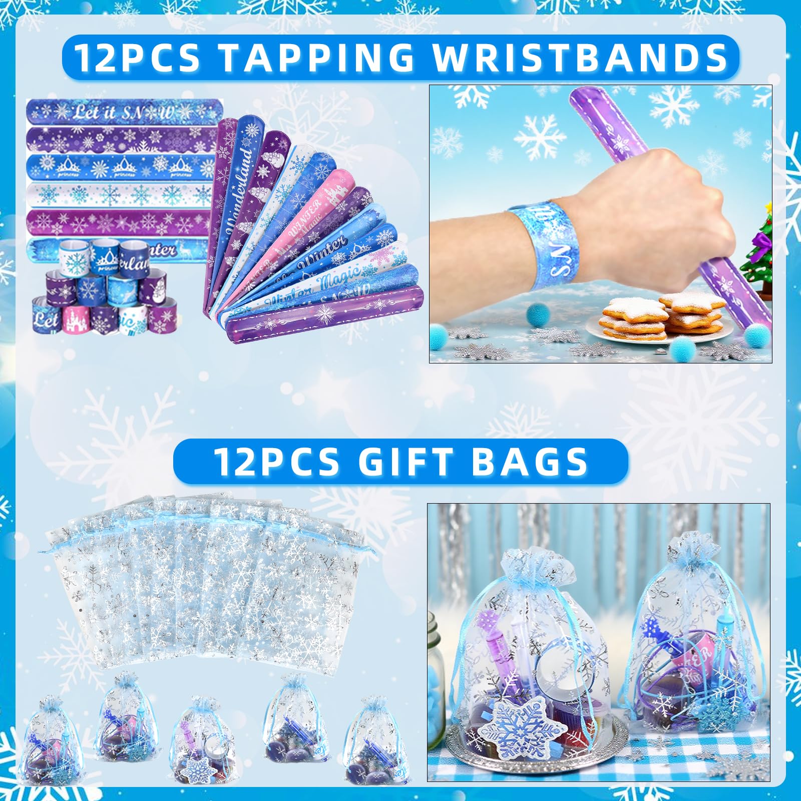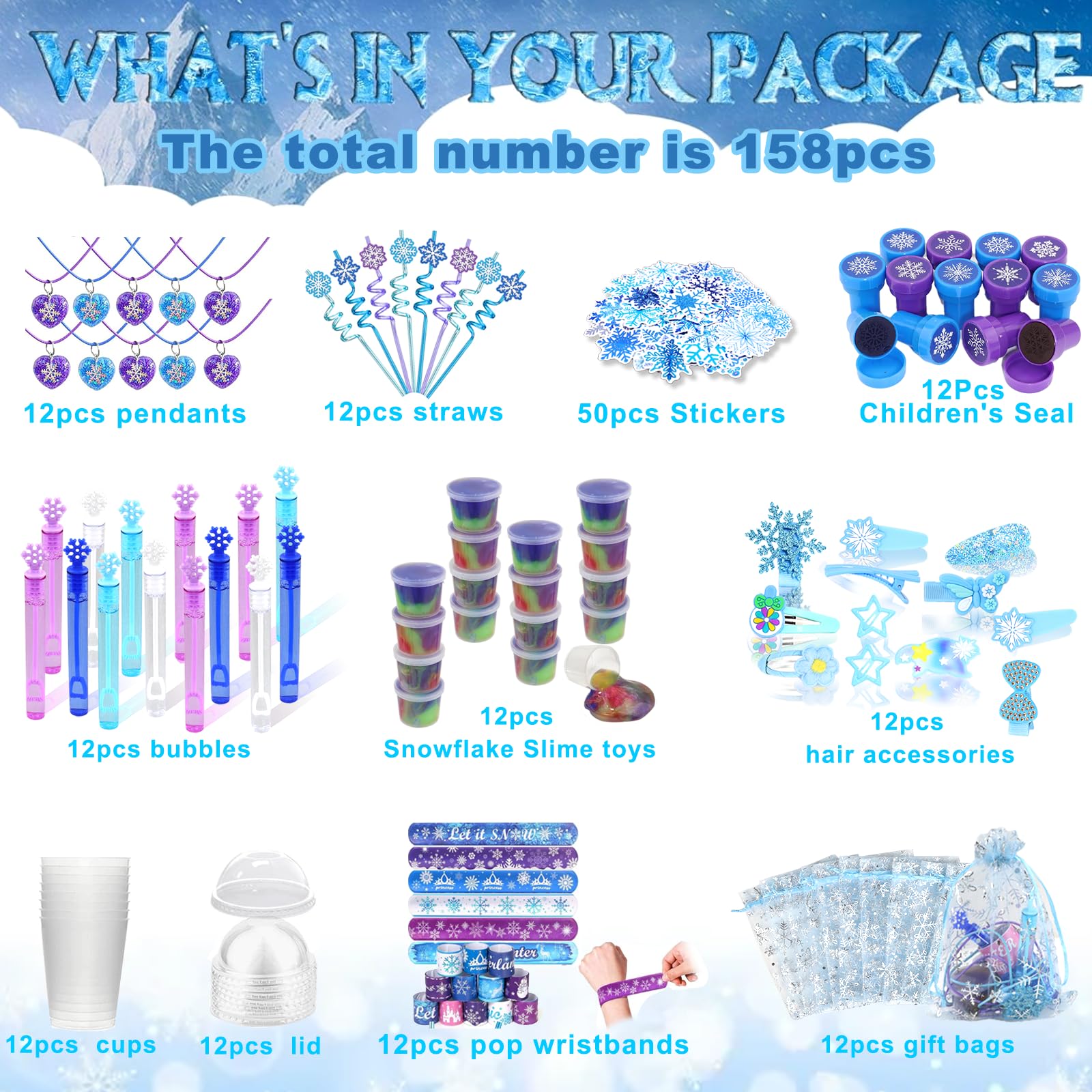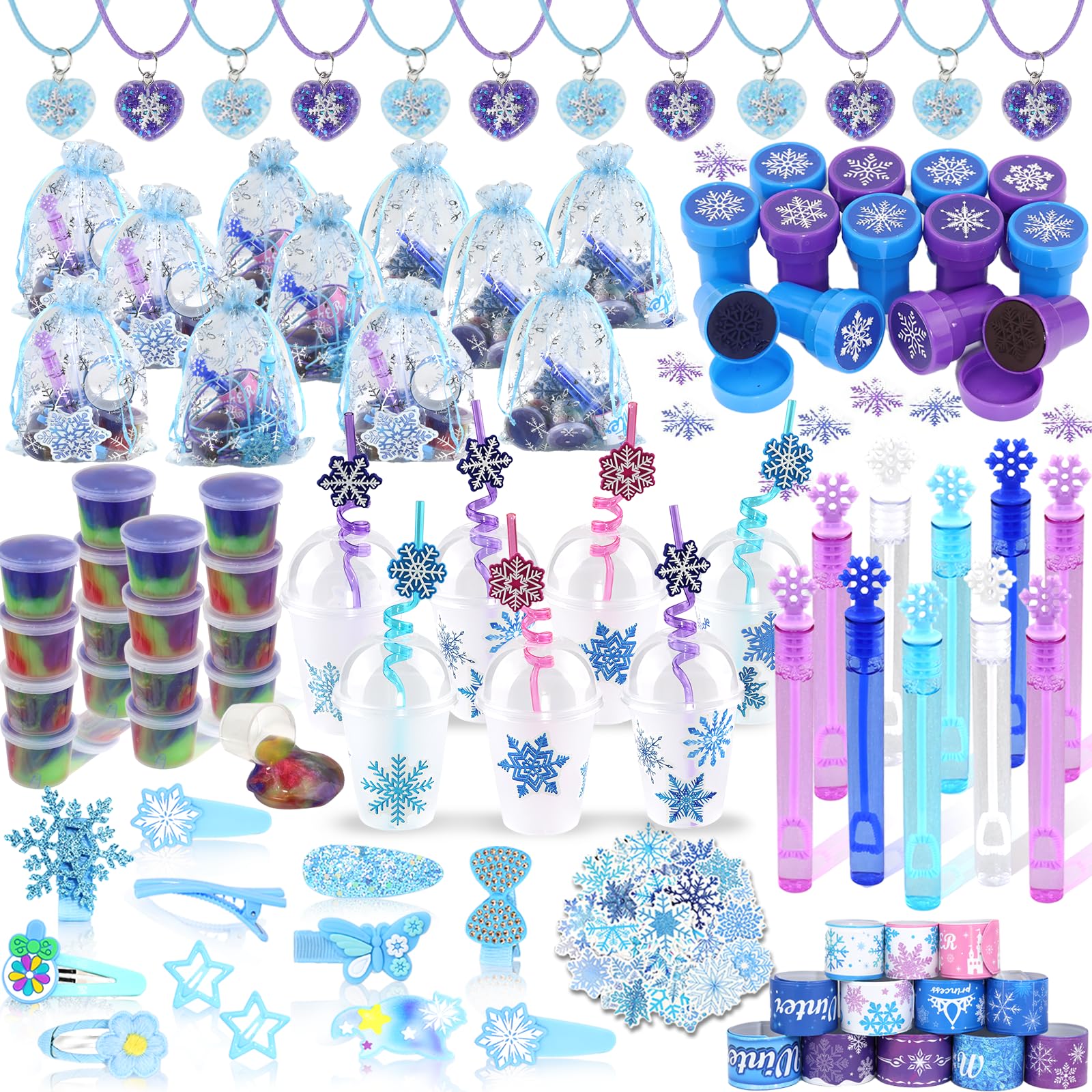 - Princess Party Favors Set: You'll receive 12 large-capacity party cups with lids, 12 snowflake straws, 12 bracelets, 12 keychains, 12 metal hair clips, 12 snowflake pendants, 12 bubble wands, 12 slime putty, 50 stickers, and 12 gift bags. A total of 170-piece super large kid‘s party pack.
