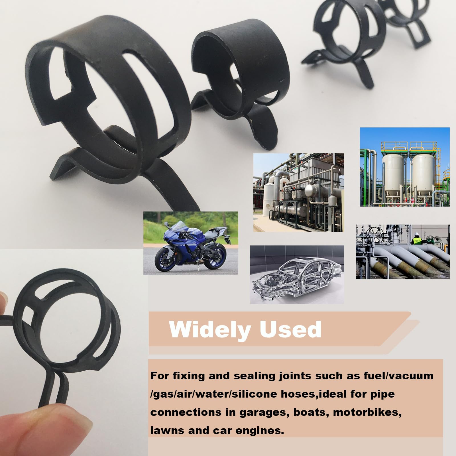 - 【Wide Application】-- Spring hose clamps are widely used, suitable for fastening and connecting various pipes such as fuel pipes/gas pipes/vacuum hoses/air hoses/water pipes/silicone hoses, etc. It is the great choose for garage, boats, motorcycles, lawn mower and car engines connection, etc.