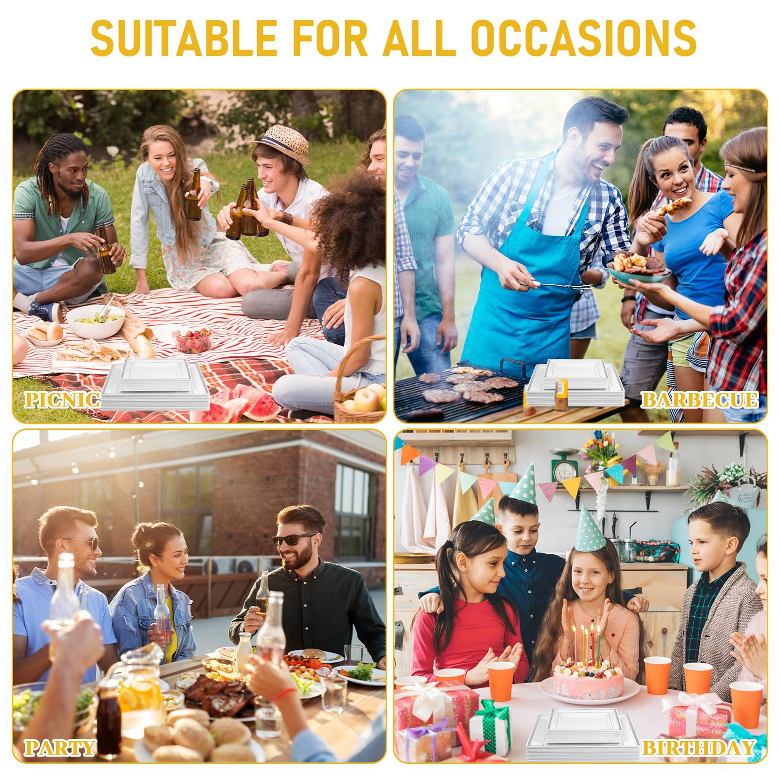 - 【Elegant Design】Add a touch of elegance and refinement to your next party or dinner event. With a elegant silver rim design, the disposable dinnerware set exudes luxury and elegance, making it the perfect choice for Halloween, Parties, Thanksgiving, New Year.