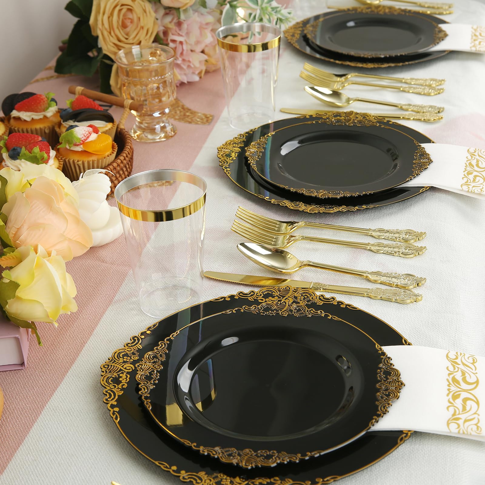- DINNERWARE SET:Black and gold plastic plates set includes 25 black wedding plates with gold trim,25 black plastic dessert plates, 25 gold plastic silverware,25 black and gold plastic cups,25 gold napkins. You can get full of the goods on your party you need.