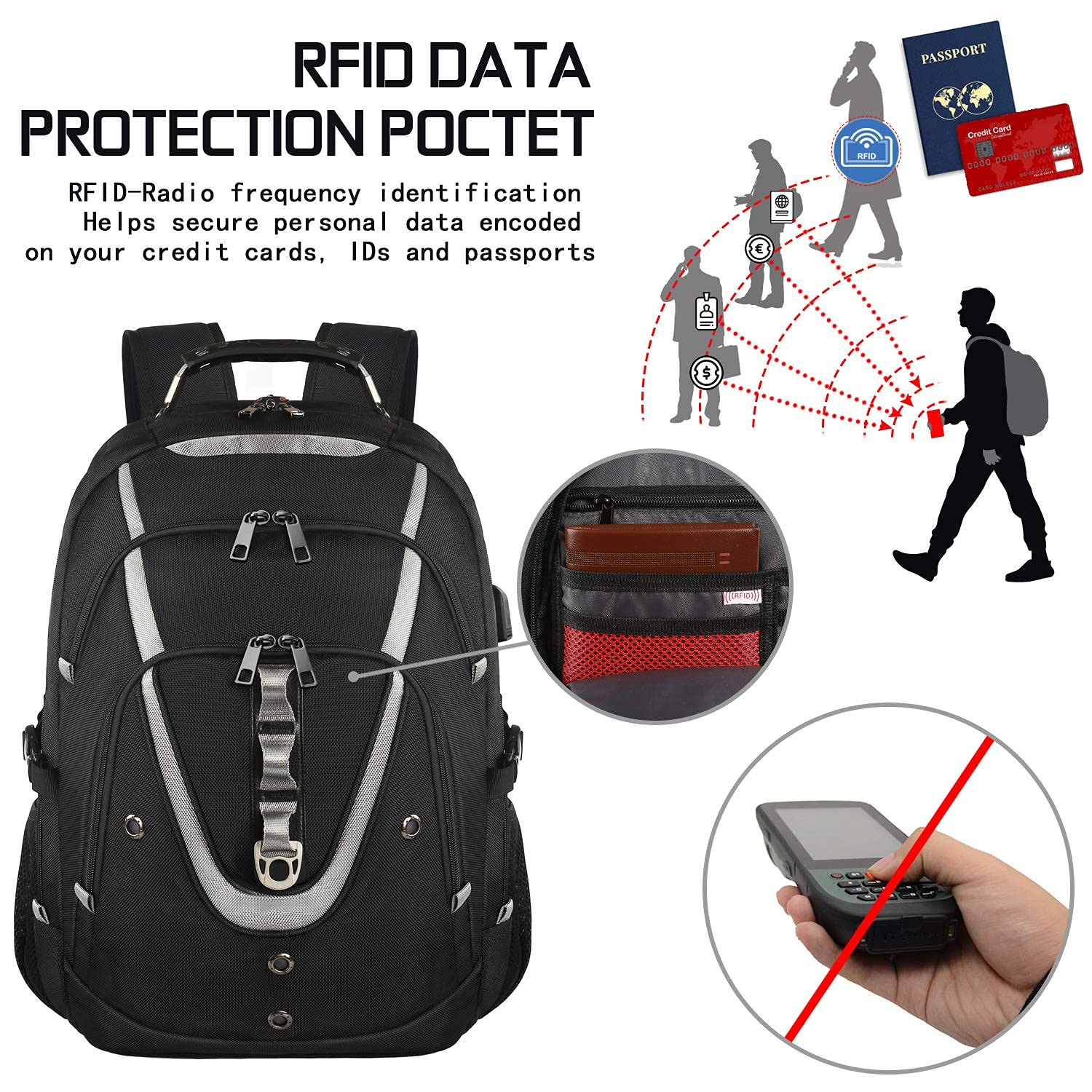 - RFID BACKPACK & ANTI-THEFT:RFID Pockets with RFID-radio frequency identification helps secure personal data encoded on you credit cards, IDs and passports.The oversized anti-theft pocket on the back of the extra large backpack makes it easy to put your phone and wallet in.Design of an air-flow back padding system and a secret pocket ensures great comfort and safety in your journey.I hope that your journey will be safe and enjoyable.