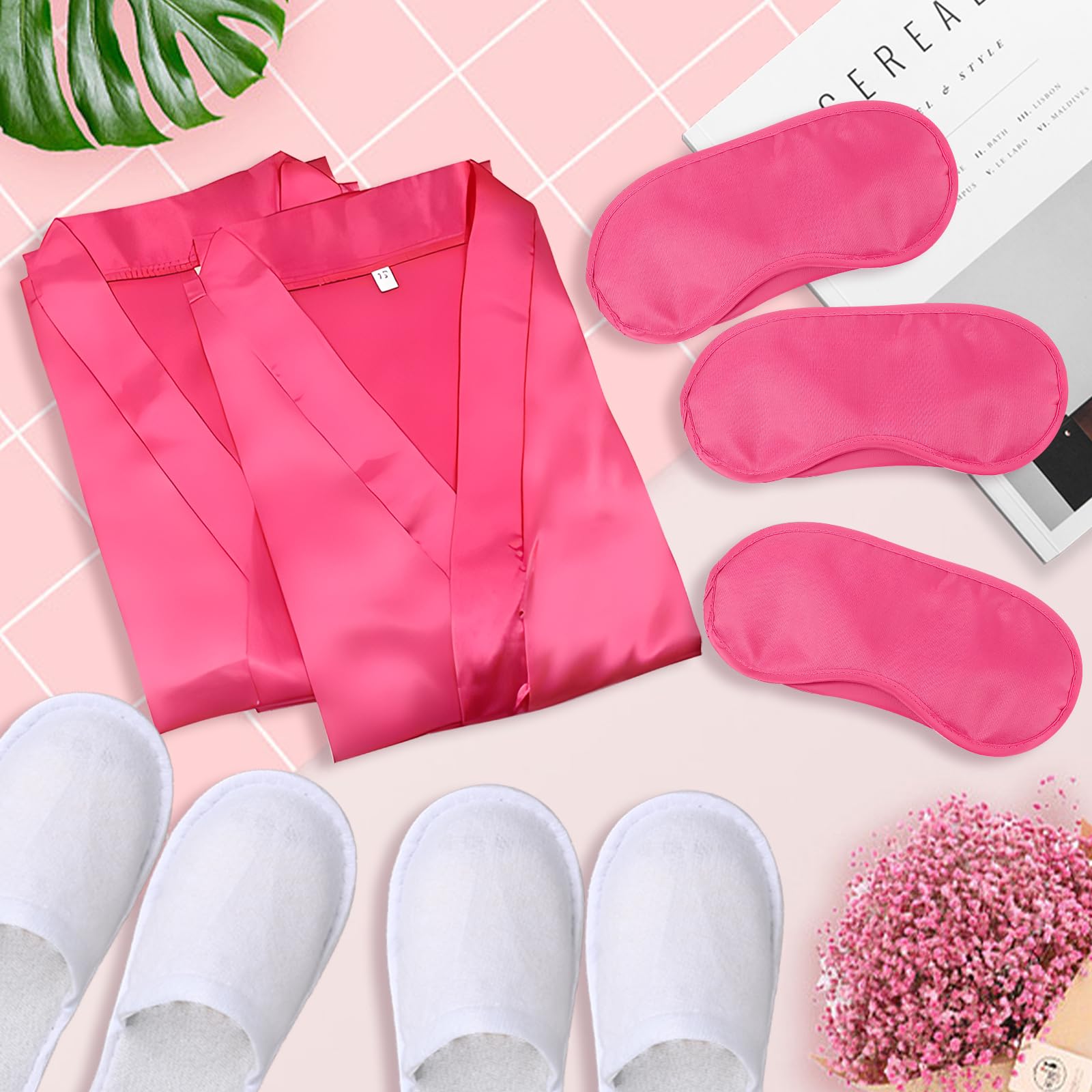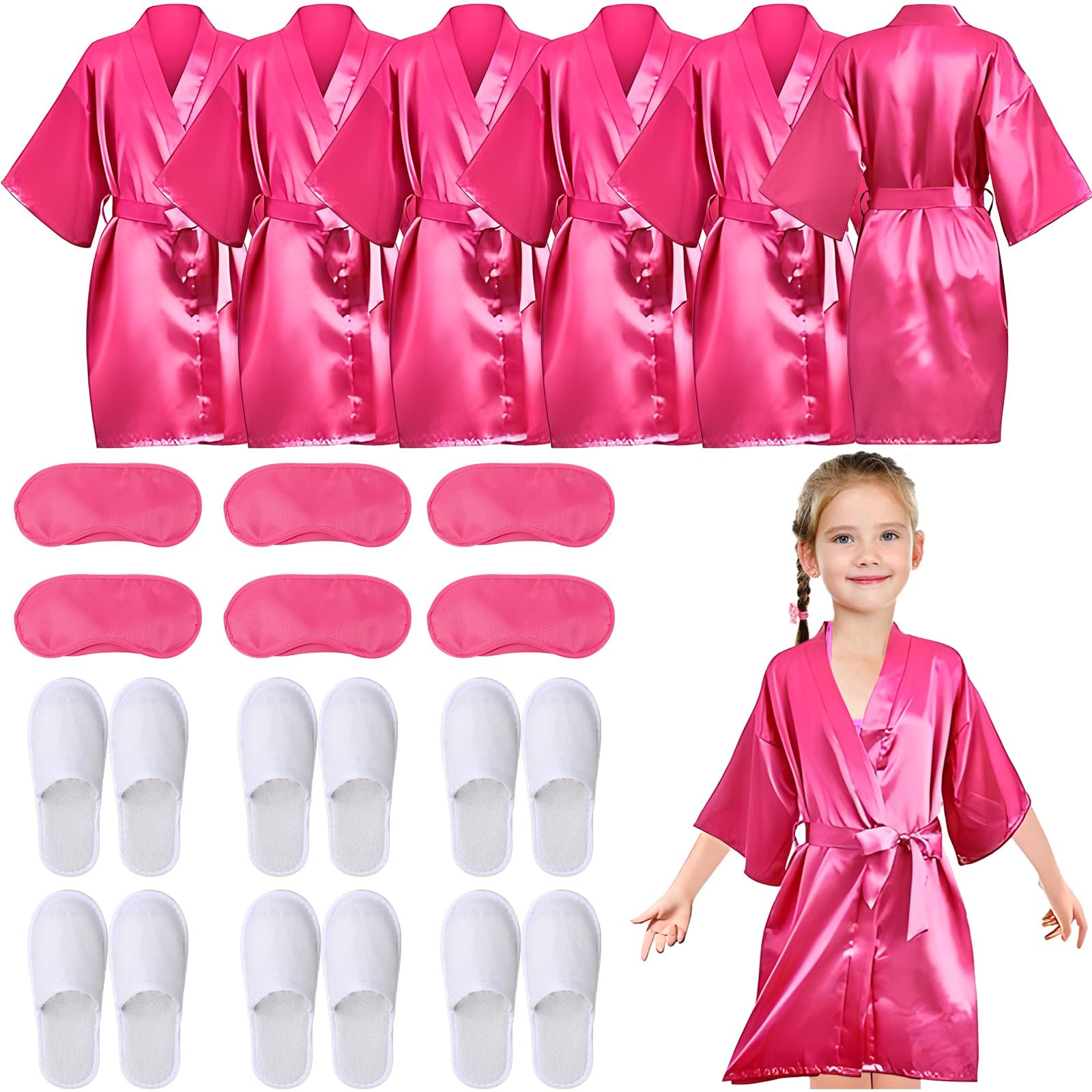 18 Pcs Spa Party Supplies for Girls 6 Satin Kimono Robe 6 Sleeping Eye Mask 6 Disposable Slippers for Flower Girl Kid Salon Pedicure Wedding Birthday Favors Washing Shower (Size 10, Rose Red)