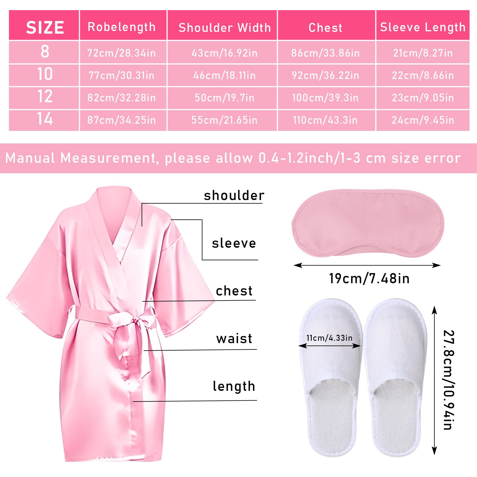 18 Pcs Spa Party Supplies for Girls 6 Satin Kimono Robe 6 Sleeping Eye Mask 6 Disposable Slippers for Flower Girl Kid Salon Pedicure Wedding Birthday Favors Washing Shower (Size 14, Pink)