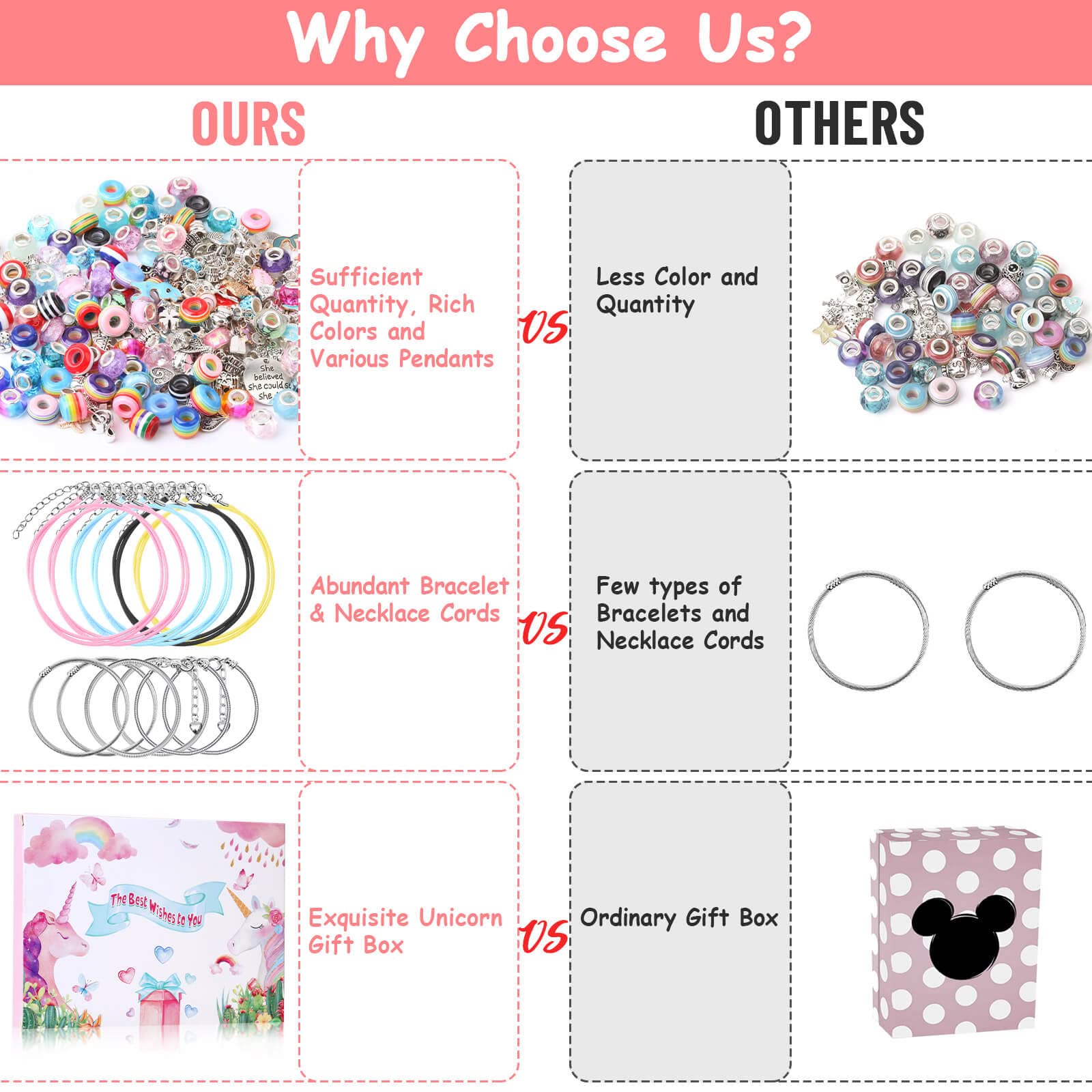 You will get a unicorn-packed charm bracelet making kit that contains more jewelry making accessories in quantity, color and variety than any others.