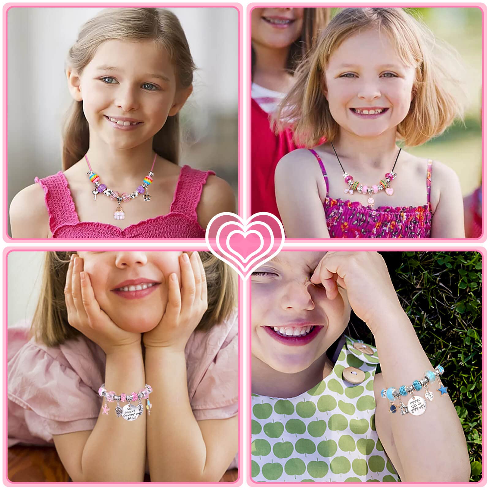 - The DIY charm bracelets kit can bring more potential benefits to your sweetheart: Parents can play with their children to create eye-catching and unique bracelets, enhance parent-child relationships, and inspire children's creativity and imagination. The charm bracelet kit can also boost youngsters' hands-on ability, making them shine in Girl Scouts or sisterhood.