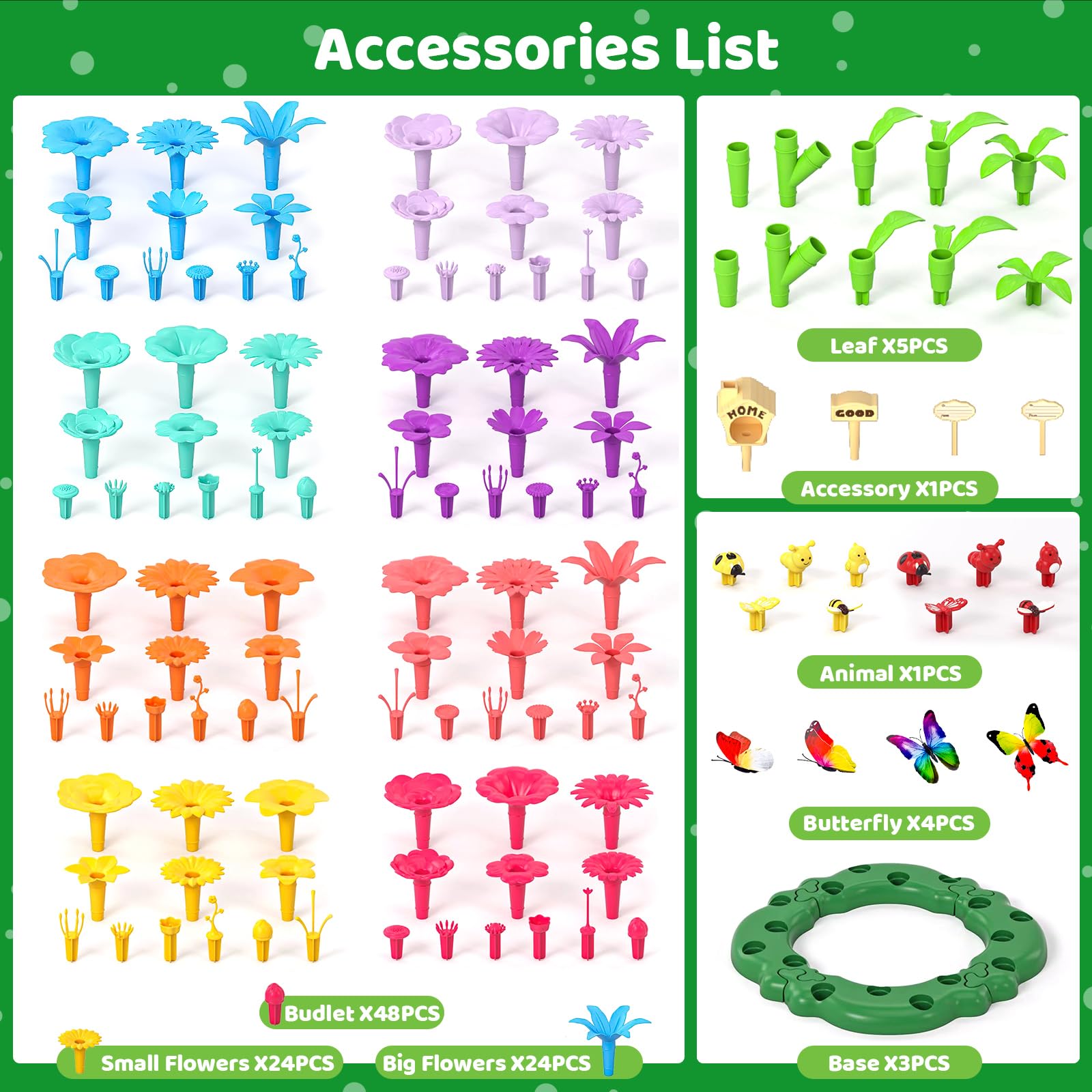 - DIY Your Own Garden:184 PCS in abundant Colors Flower Building Toy Set. Assemble, disassemble, and rebuild a flower garden. All parts included in this flower building toy set are interchangeable, so kids can use their imagination to combine beautiful butterflies, colorful flowers, stems and leaves freely to create their own unique garden
