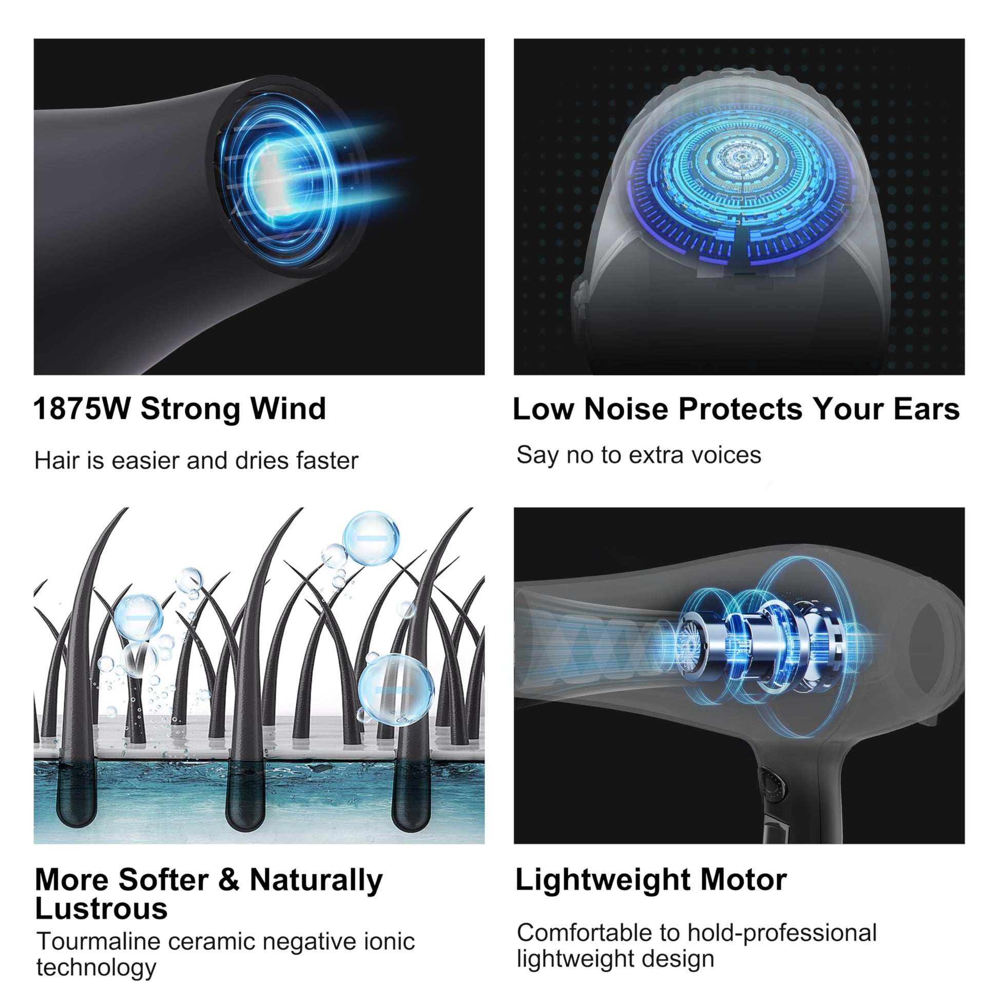 1875W Fast Drying, Professional Salon Hair Dryer with Diffuser & Comb & Concentrator Nozzle (Black)