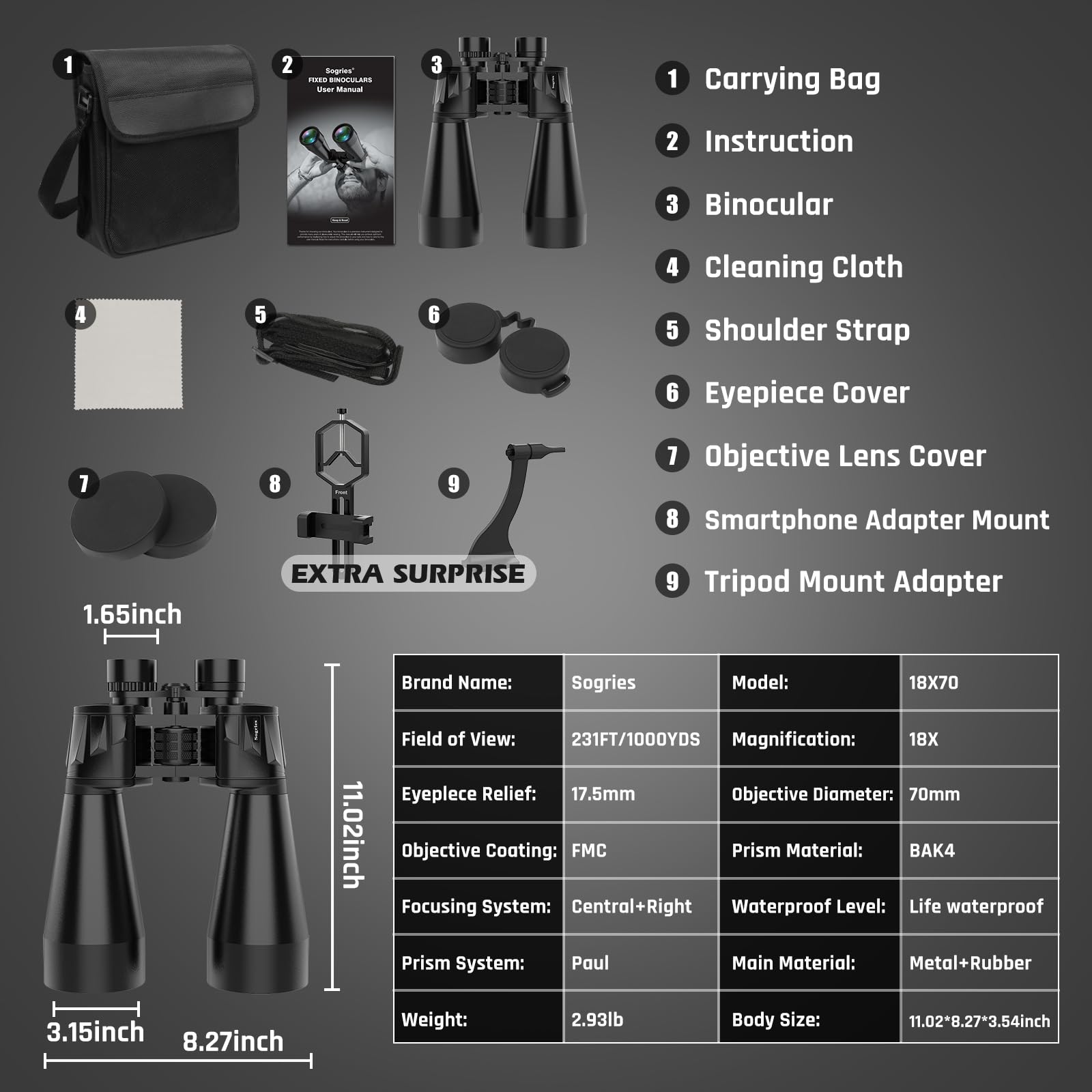 - POWERFUL 18X MAGNIFICATION & 70MM LARGE OBJECTIVE--- The high-powered binoculars with 18X magnification and 70mm large objective lens offer a unique opportunity to experience the world in a new light. They provide a level of detail, clarity, and breadth of view that to satisfy and delight users of all interests
